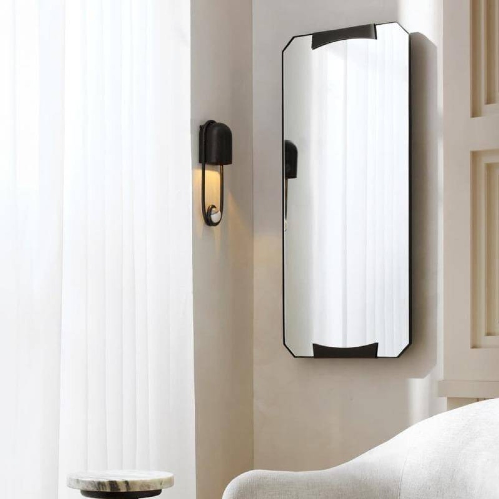 Elegantly modern, the Kris Rectangular Mirror displays a refined geometric design. Gracefully formed brass clasps hold this mirror top and bottom, all in a bronze finish over a blackened iron frame. The raised design creates depth and adds chic sophistication. Security cleat hanging hardware included and allows for vertical or horizontal display.
