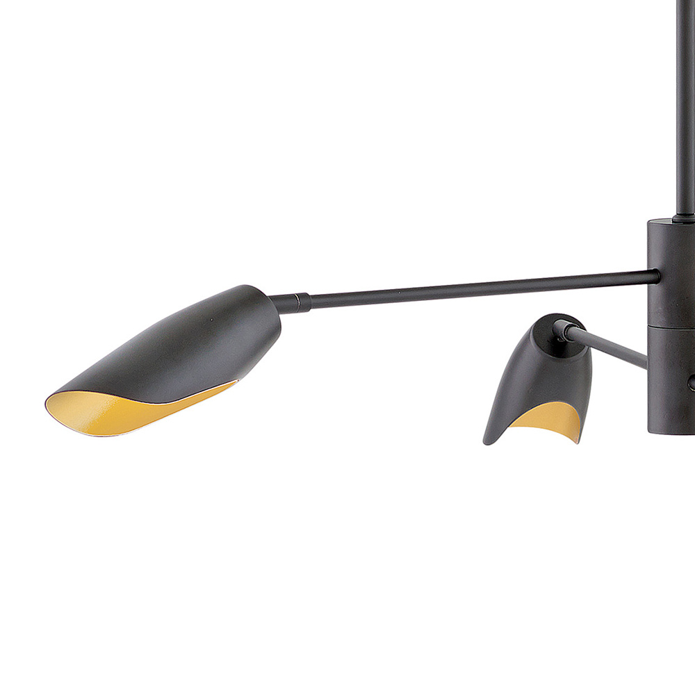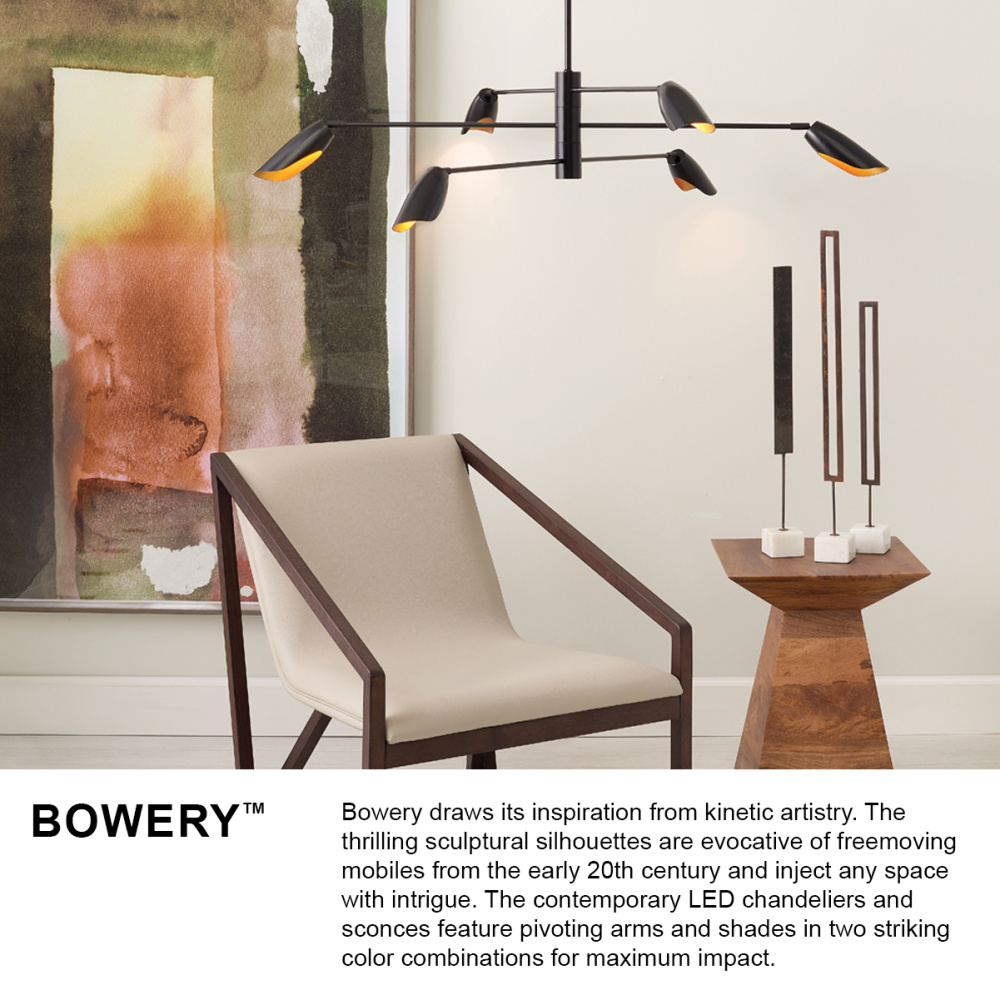 Bowery draws its inspiration from kinetic artistry. The thrilling sculptural silhouettes are evocative of free-moving mobiles from the early 20th century and inject any space with intrigue. The contemporary LED chandeliers and sconces feature pivoting arms and shades in two striking color combinations for maximum impact.