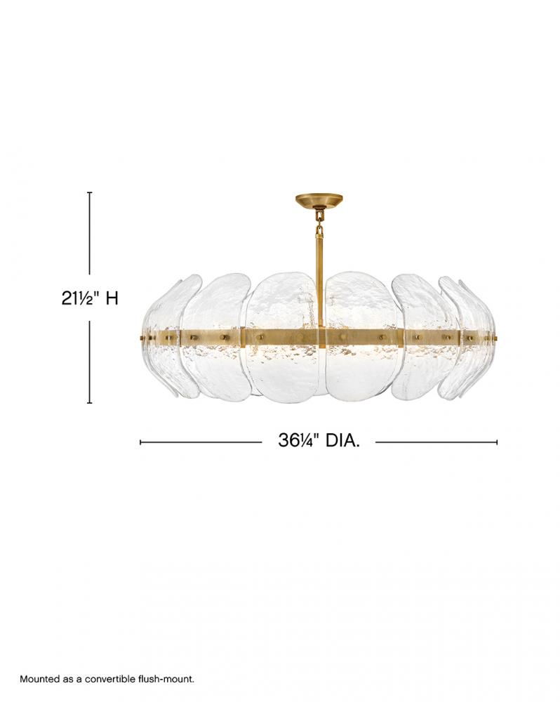 Inspired by the organic elegance of blooming water lilies, Lillia’s large shade is formed from gently curved glass panels. Subtle handcrafted texture creates natural variations in illumination, accentuated by a classic Heritage Brass finish.
