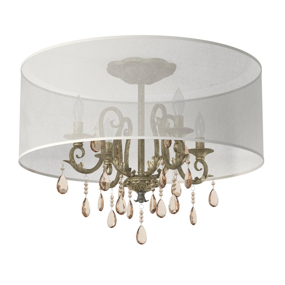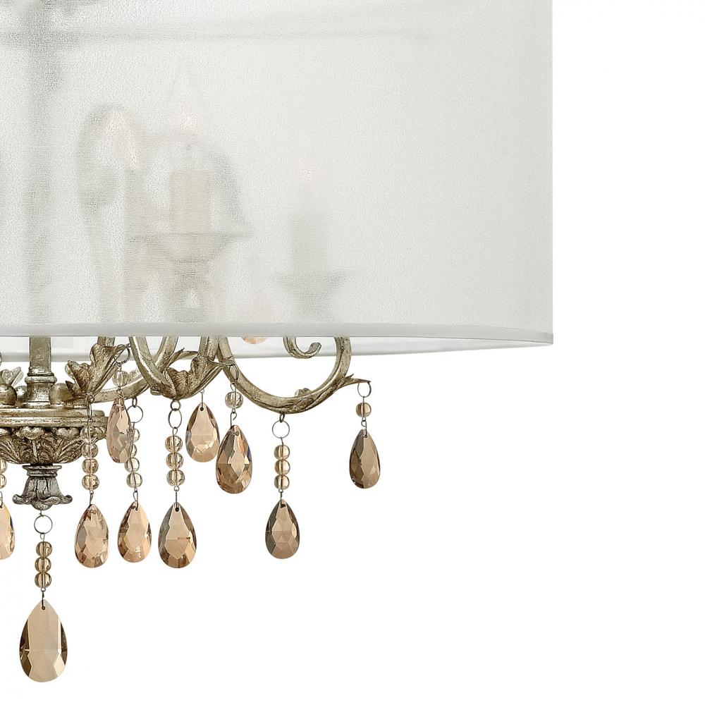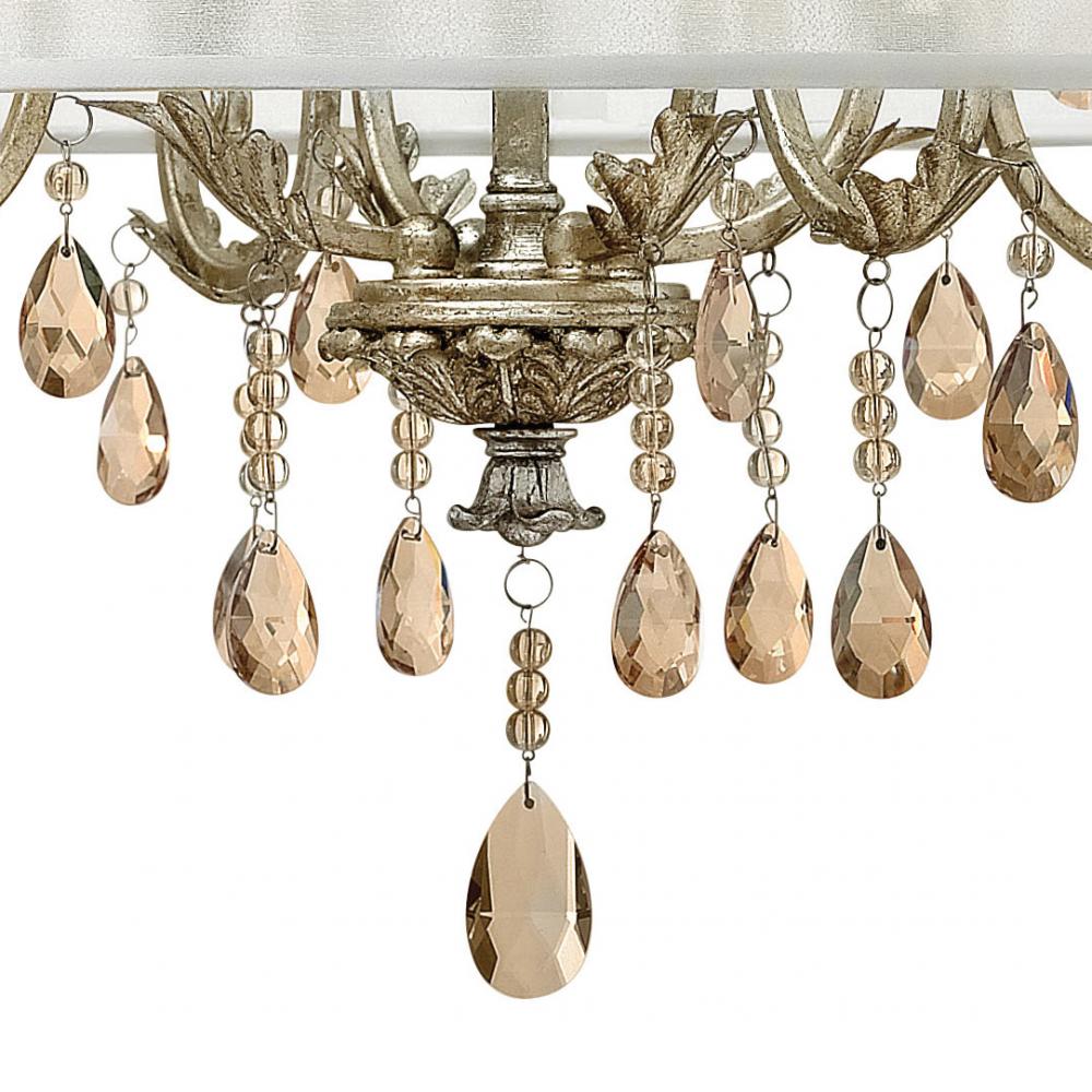 Carlton's elegant petite candelabra iron design, finished in authentic Silver Leaf, makes a sophisticated statement with luxurious amber pearl crystals, optional translucent organza shade and ornate details.
