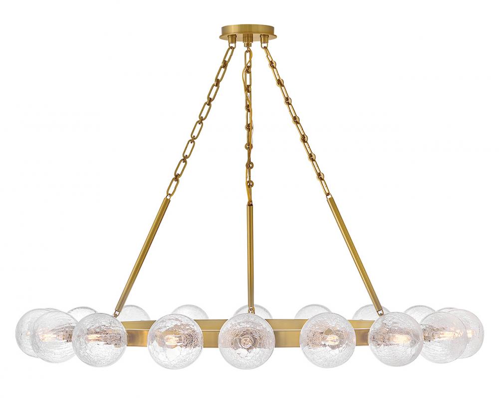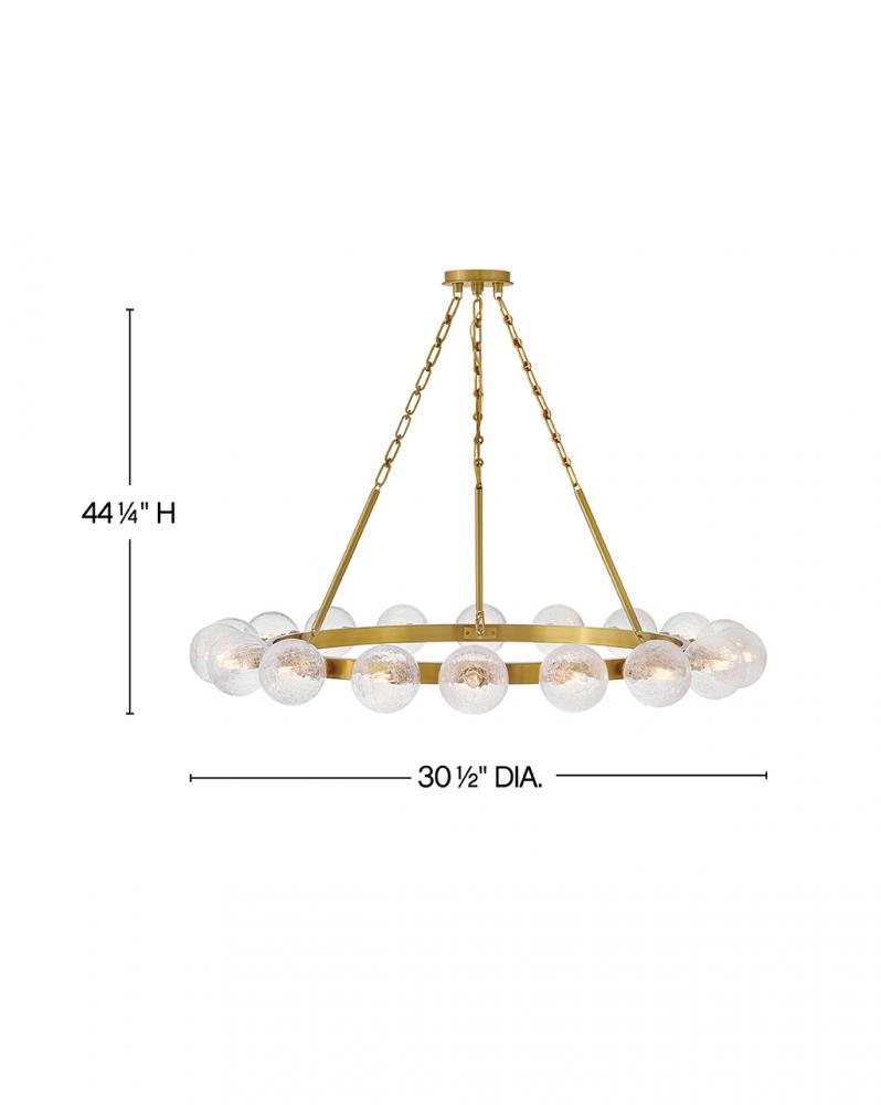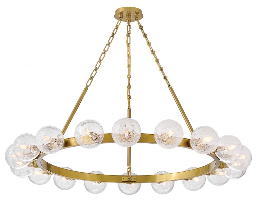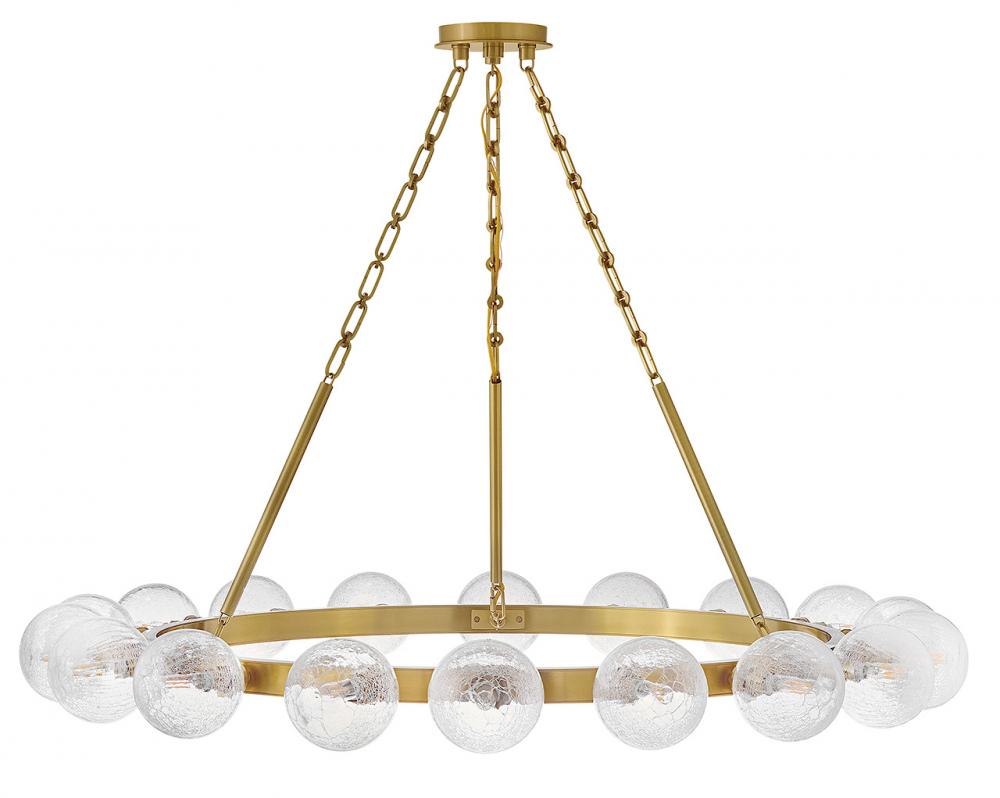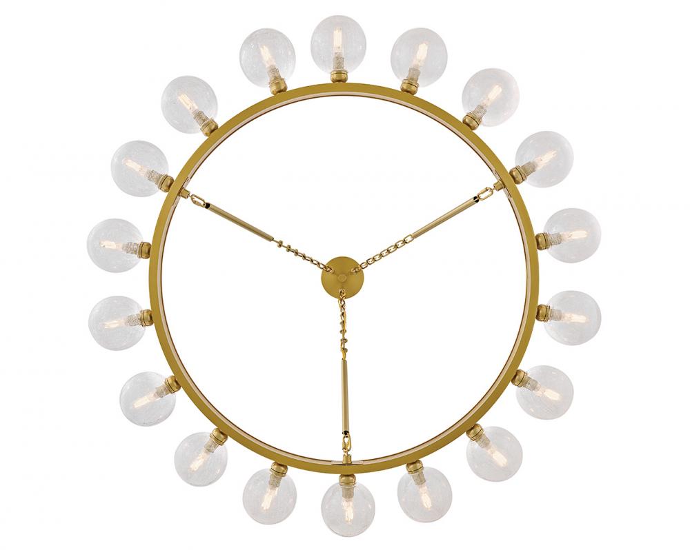 Dramatic crackled glass globes surround Coco’s timeless silhouette with unexpected, distressed detailing. Minimal framing suspended from decorative stem-to-chain uprights features a warm and inviting Lacquered Brass finish.