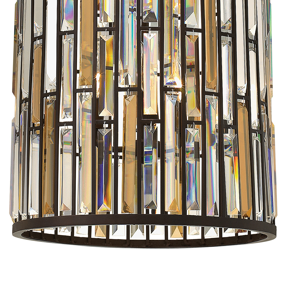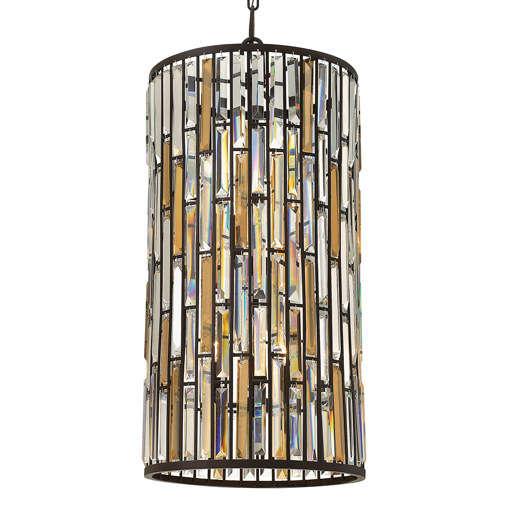 Gemma is a contemporary chandelier collection with stunning rectangular prisms of amber pearl and clear crystal set within a frame of Vintage Bronze or Silver Leaf to create a seamless sparkling, jewelry-like effect.
