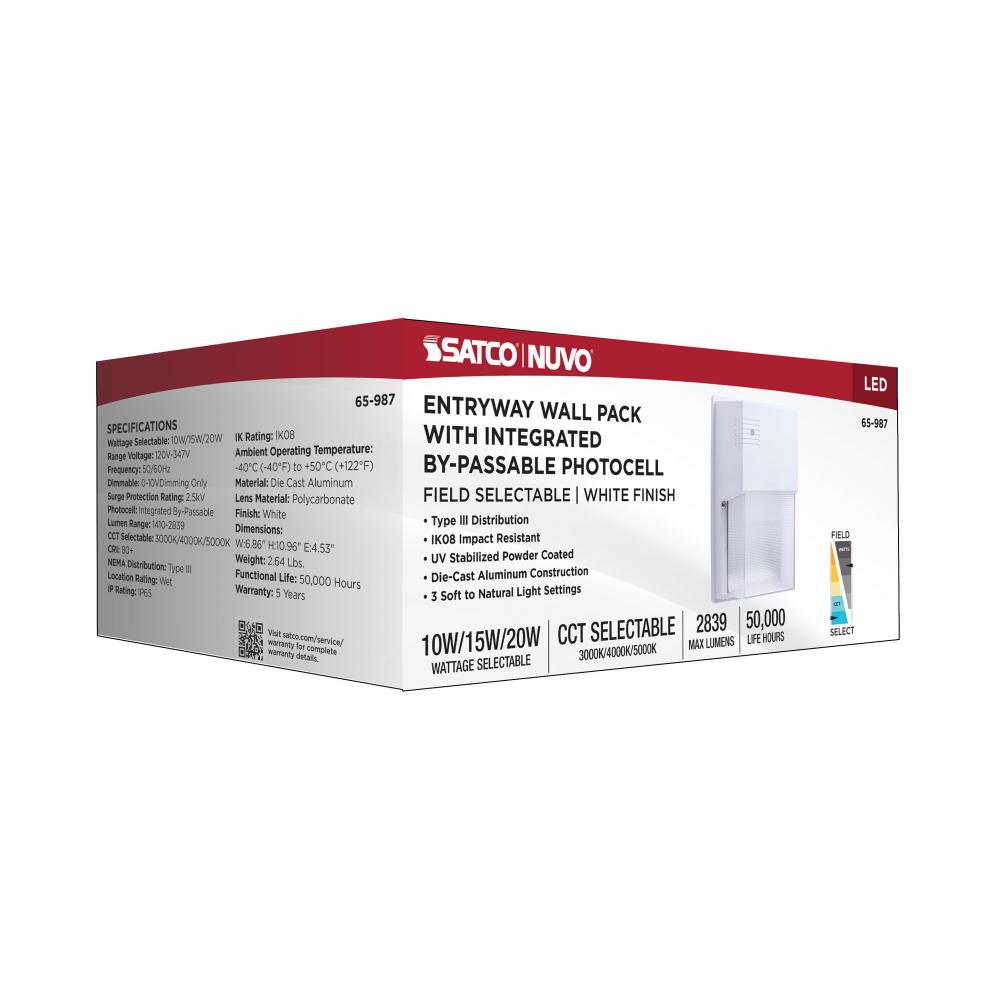 LED Entryway Wall Pack; 10/15/20 Wattage Selectable; 30K/40K/50K CCT Selectable; White Finish