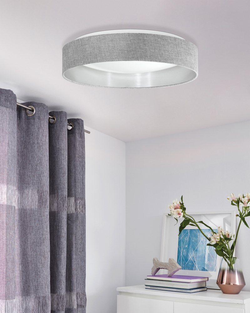 The MANDANA ceiling light features a round shade made of gray fabric and a matte nickel metal suspension. The shade is combined with a silver-colored interior, skillfully rounding off the modern design. This ceiling light blends seamlessly into minimalist interiors and offers cozy lighting for any room—whether in the living room, bedroom, or hallway.