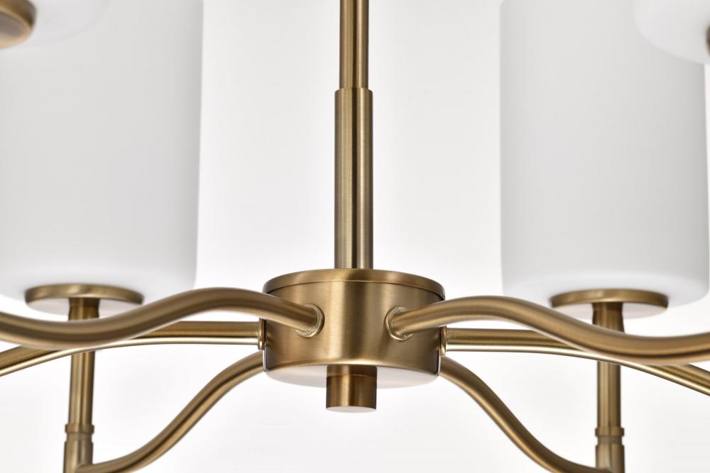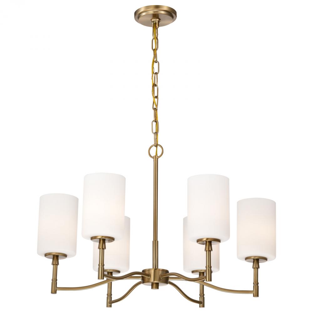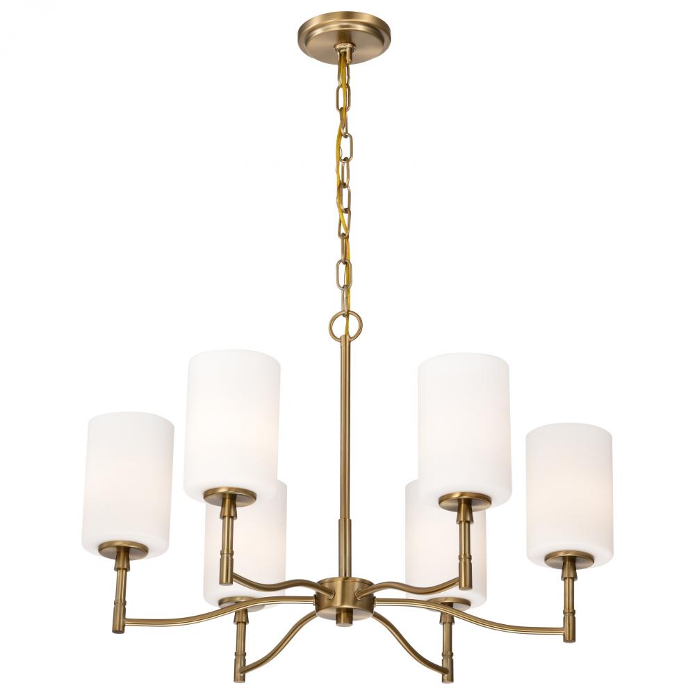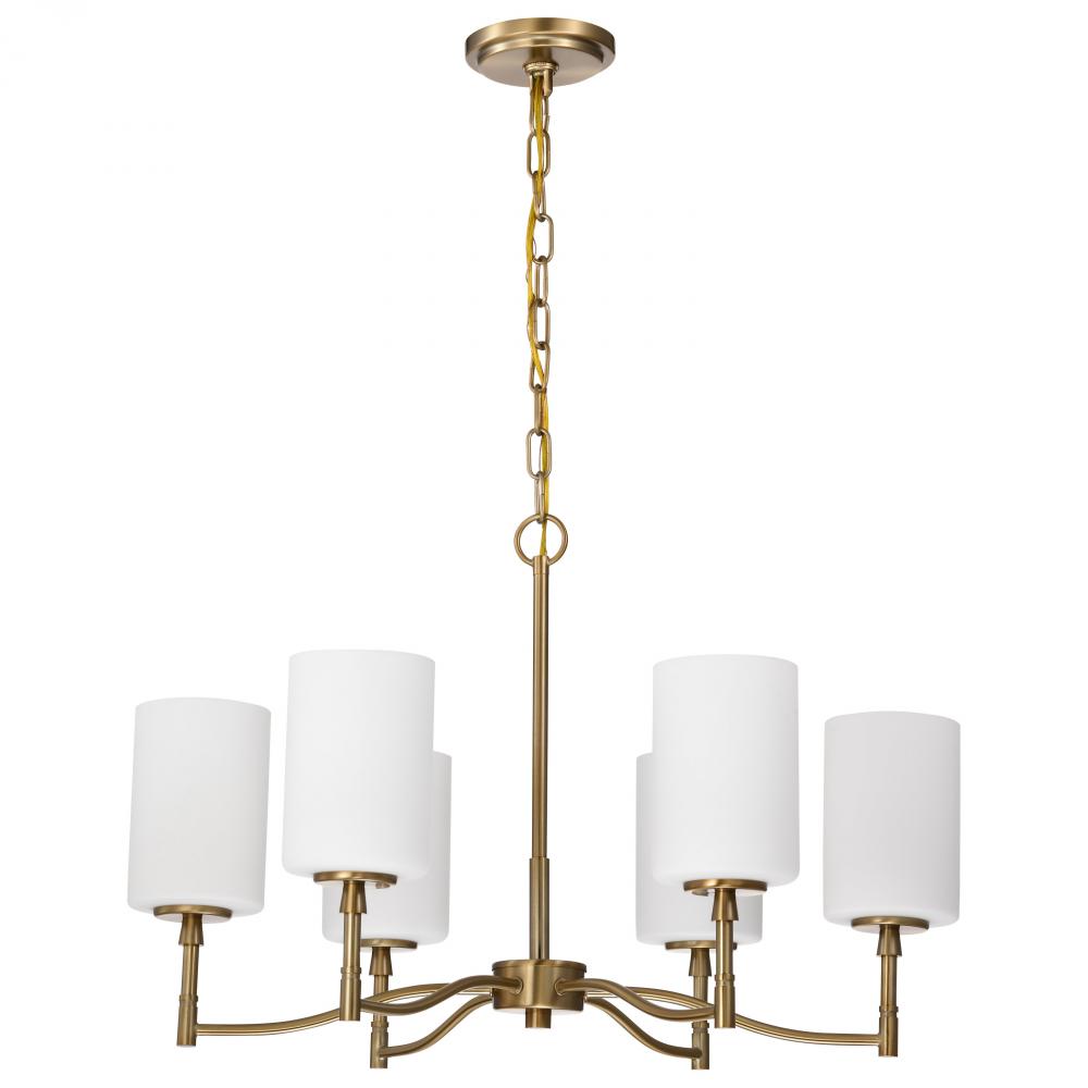 Seamlessly blending transitional design with contemporary accents, the Liam 60-8206 six light chandelier exudes understated elegance. A sophisticated burnished brass finish, perfectly complements the soft glow of white opal glass. With its broad appeal and