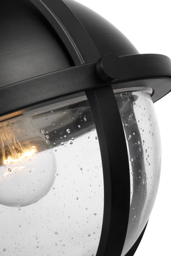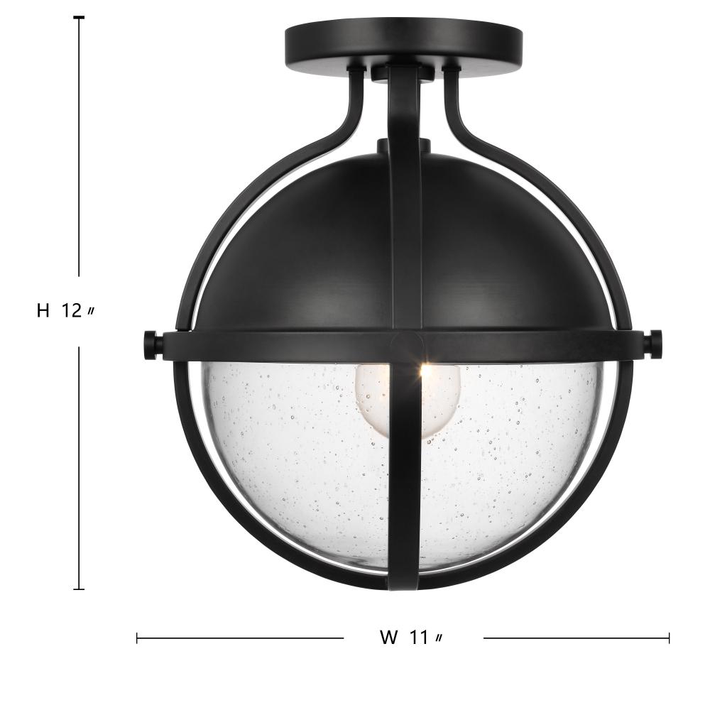 The striking Lincoln 60-7673 semi-flush mount was inspired by an armillary sphere, consisting of a framework of elegant rings. Broad, circular bands surround the orb, and knob details in a matte black finish enhance the clear seeded glass for a prominent,