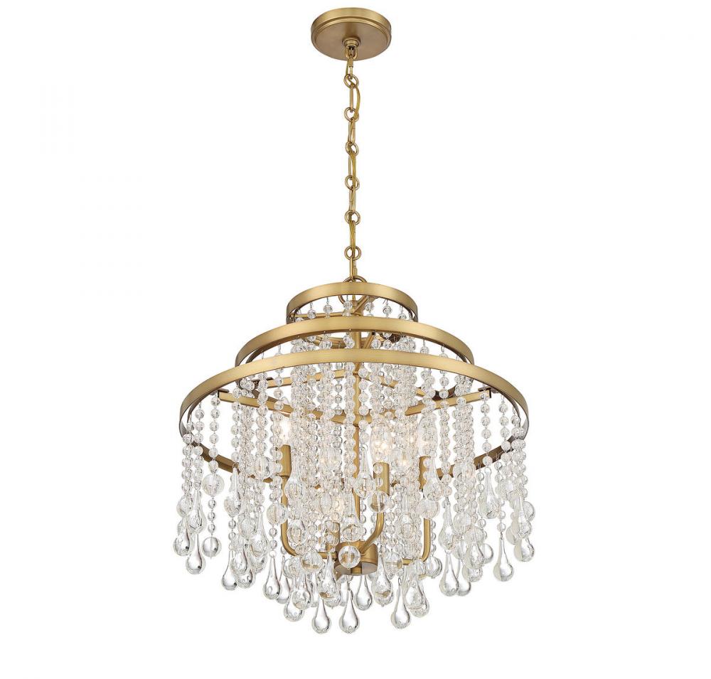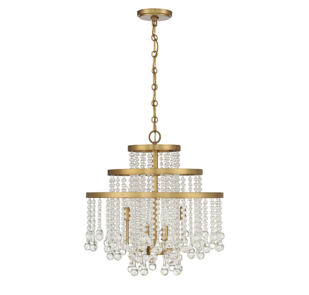 Decorate your space with the Savoy House Luna 4-light chandelier, a glamorous look that uses three tiers of lights surrounded by cascading curtains of crystal to create a boldly beautiful look. Lovingly finished in warm brass. Luna is 20" in height and 20" in width. It uses four candelabra size bulbs of up to 60 watts per bulb. Comes with 120" of chain and 144" of cord.