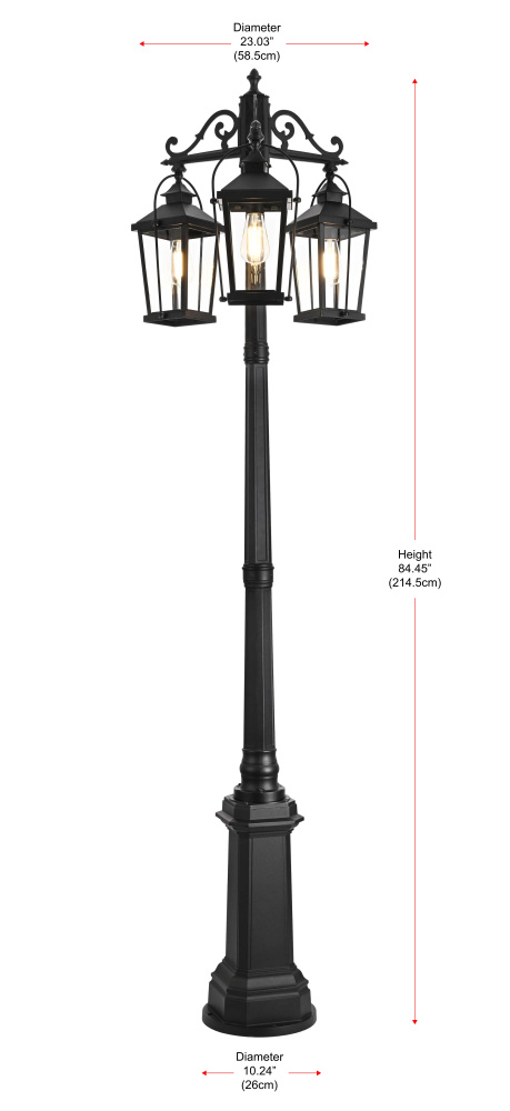 Features three lanterns mounted on gracefully curved arms, providing wide and balanced outdoor lighting.