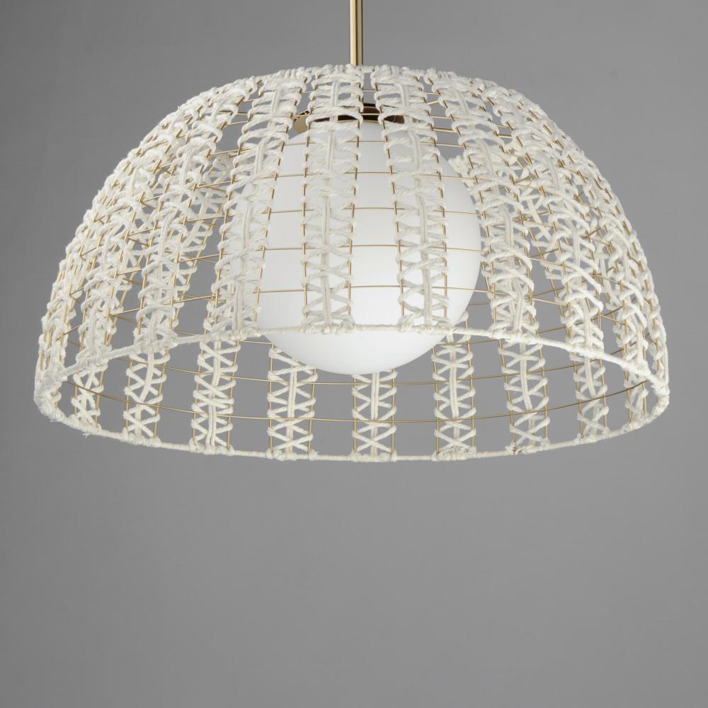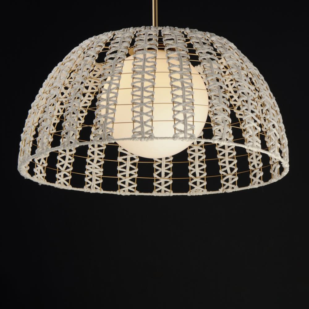 Varied cotton ropes in an Off-White finish are hand woven in a decorative pattern along a metal frame finished in Gold. Housed within these artisanal shades, Satin White glass globes softly diffuse enclosed lamps.