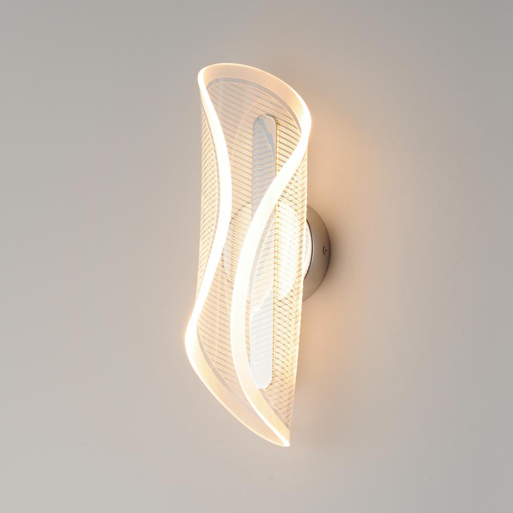 An undulating shape softly curls along its center to create an organic form constructed of a single panel of transparent acrylic. Further enhancing the form is the captivating effect of the frosted band around the borders and the patterned etching on the a