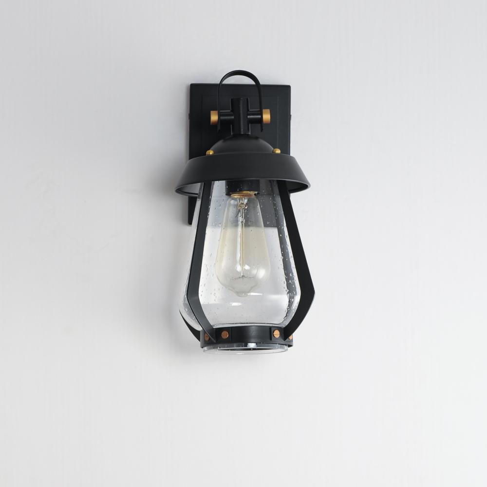 A nod to the nautical, the Marin outdoor sconces feature a two-tone frame of Black with Antique Brass details. Within the frame a pear shaped Clear Seeded glass shields a medium base lamp from the elements. Available in three sizes of sconce, two pendant c