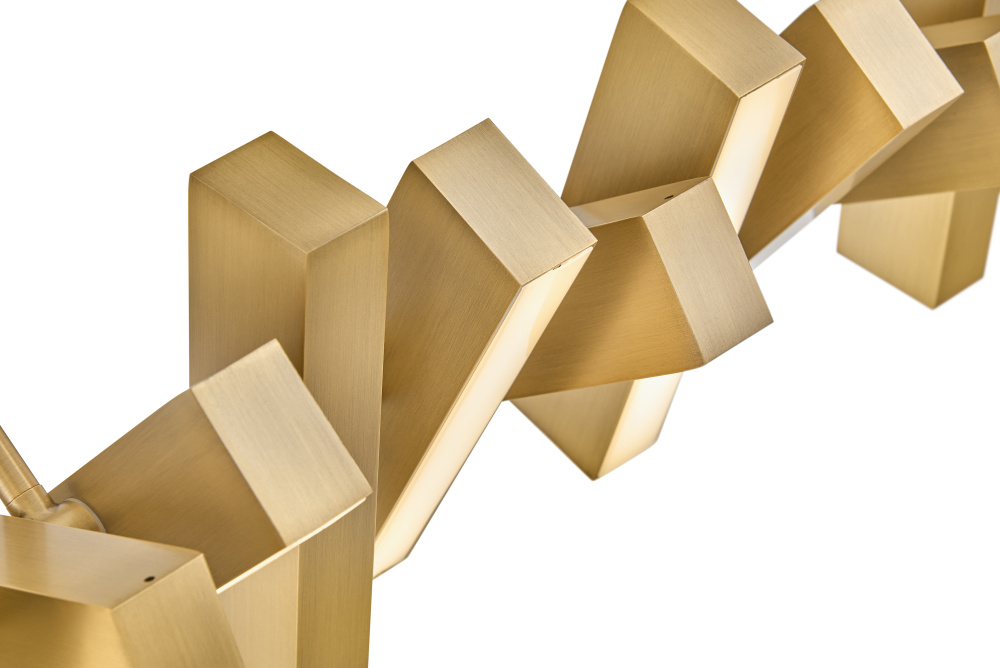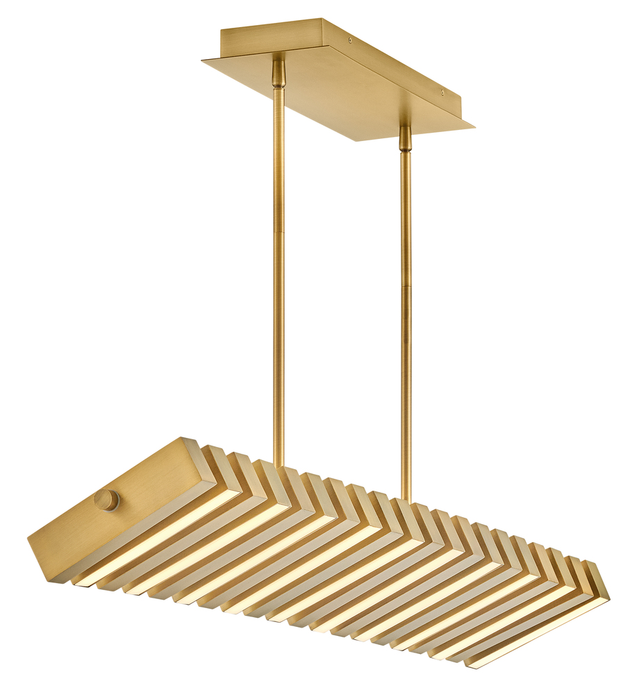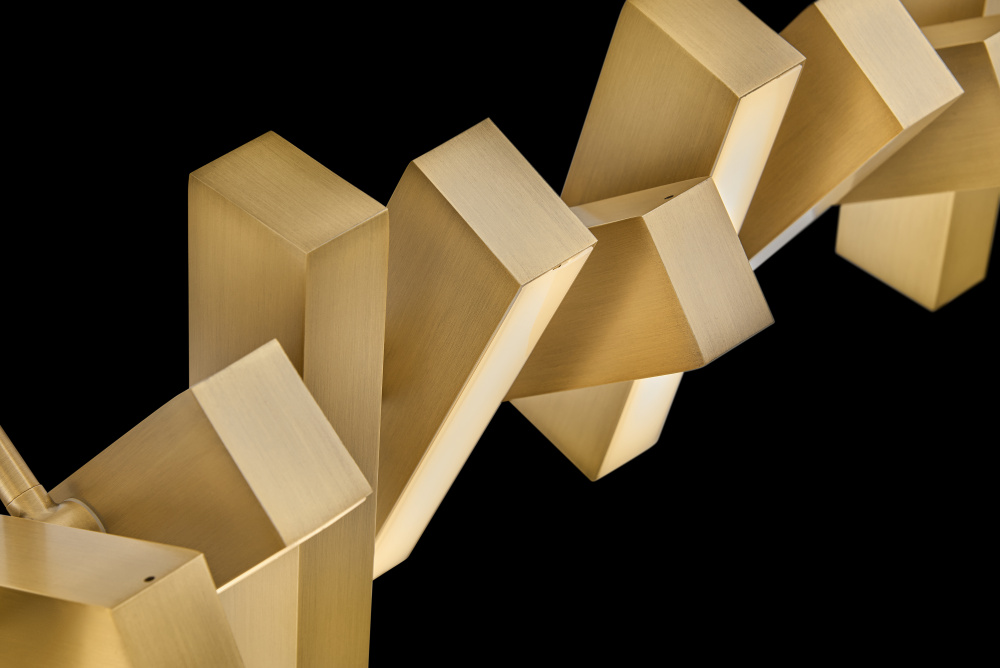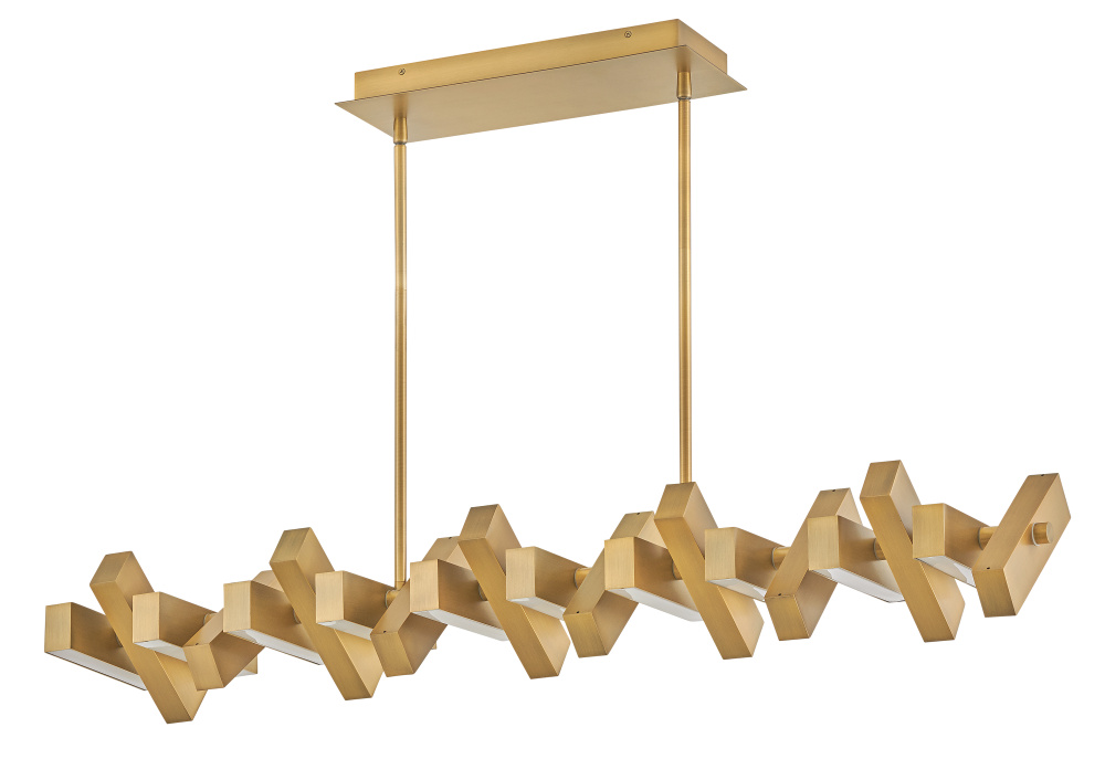 Stitch strikes a pose with an innovative design, offering bountiful illumination from articulating LED panels. This dynamic linear chandelier is a modern sculptural statement available in Painted Black Oxide or Lacquered Brass finishes.