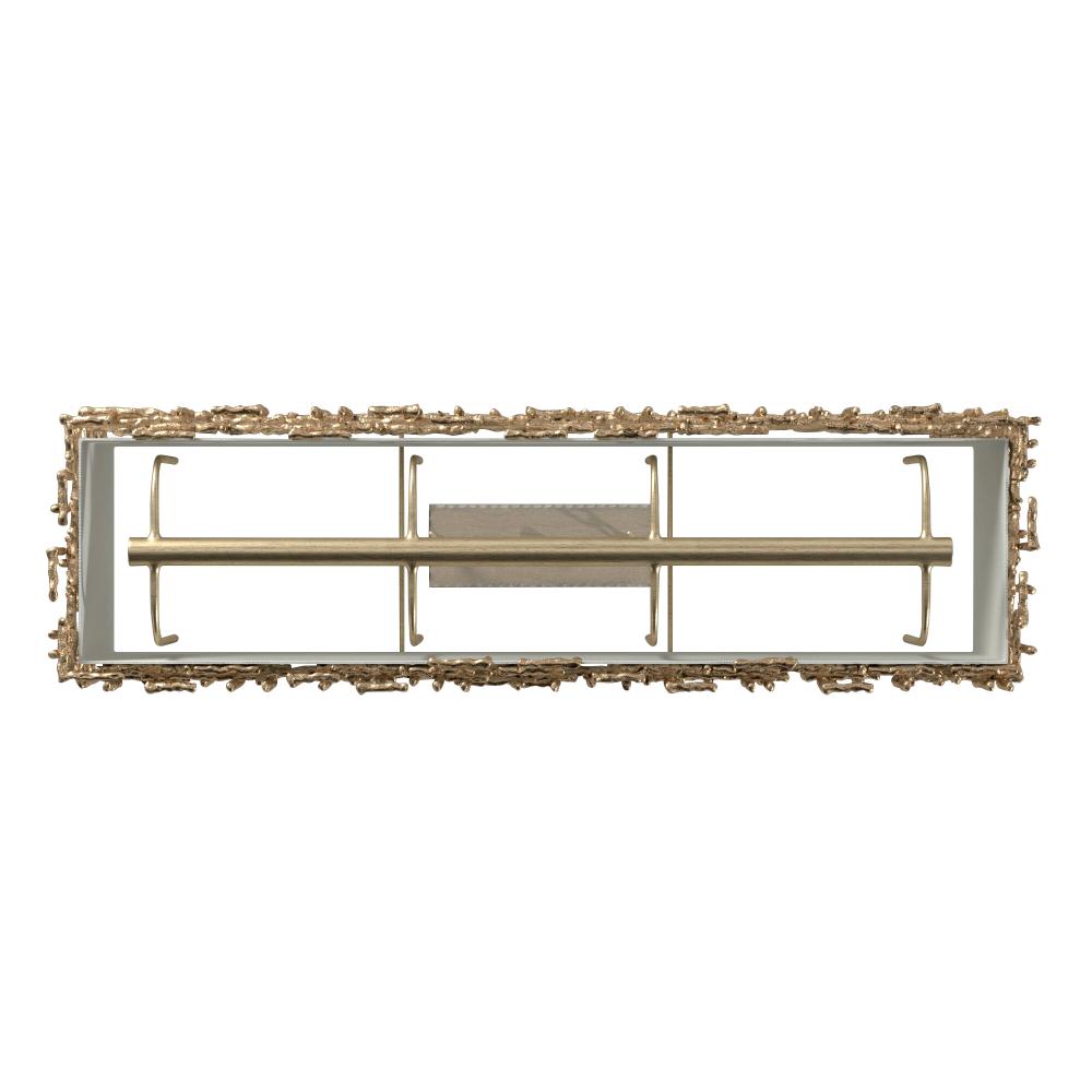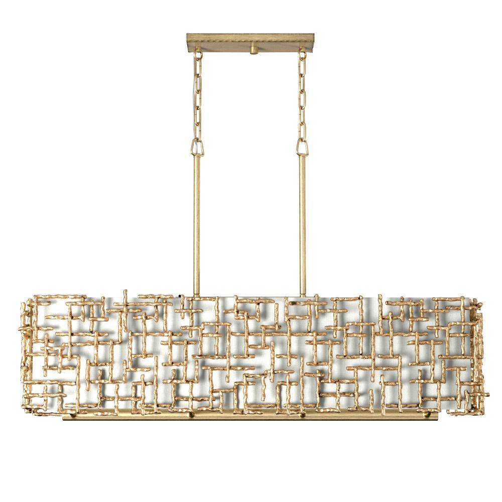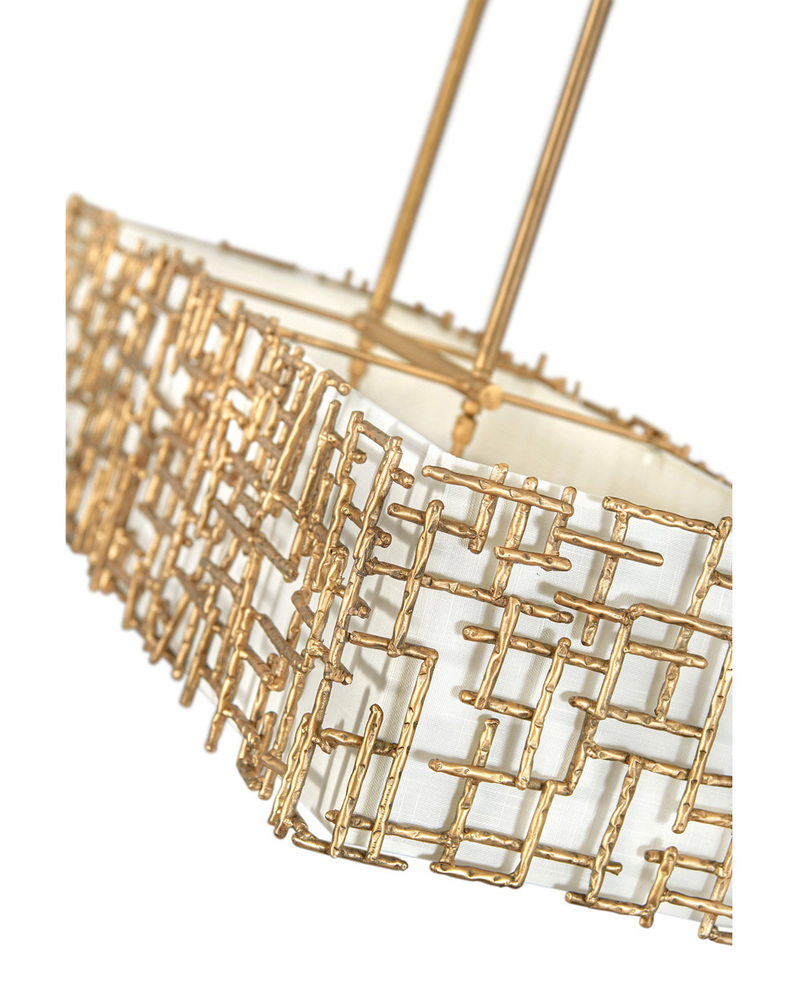 Farrah’s contemporary design is bold and sculptural, while achieving an optical airiness. The hand-hammered crosshatch bars gleam in a hand-applied Silver Leaf or Burnished Gold finish with artisanal detailing that carries through to the canopy detail. Set against a White Linen shade, Farrah creates a look of deconstructed; modern elegance.
