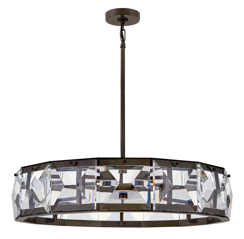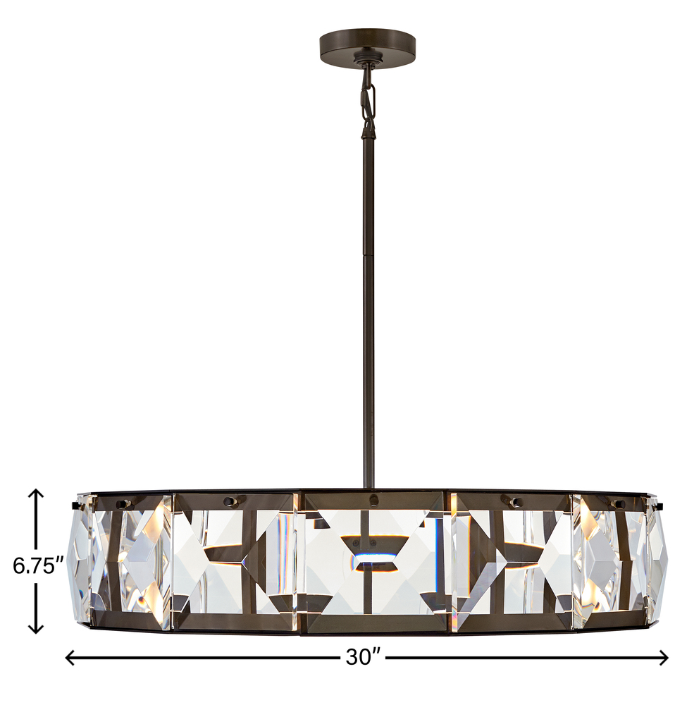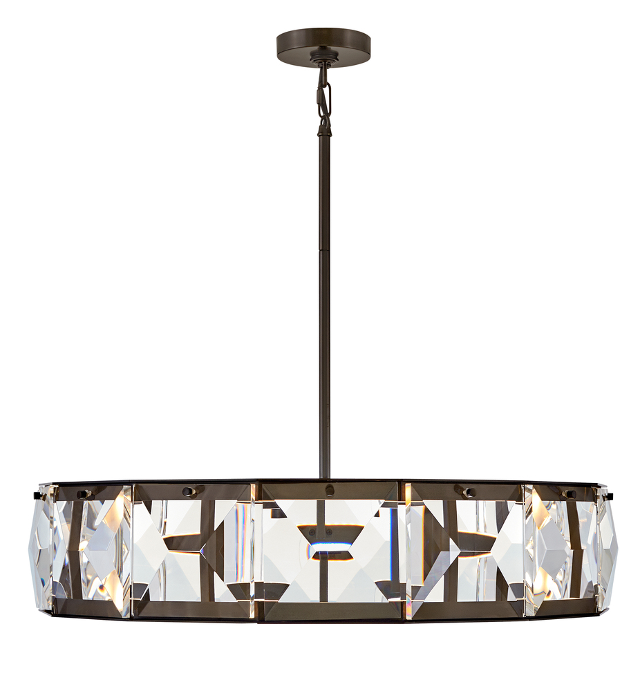 Jolie is a unique blend of sophistication, style, and technology. Integrated LEDs are sleekly concealed within gleaming Heritage Brass rings at the top and bottom of the design. Robust blocks of faceted crystal radiate with light, creating a transfixing silhouette while providing outstanding illumination.