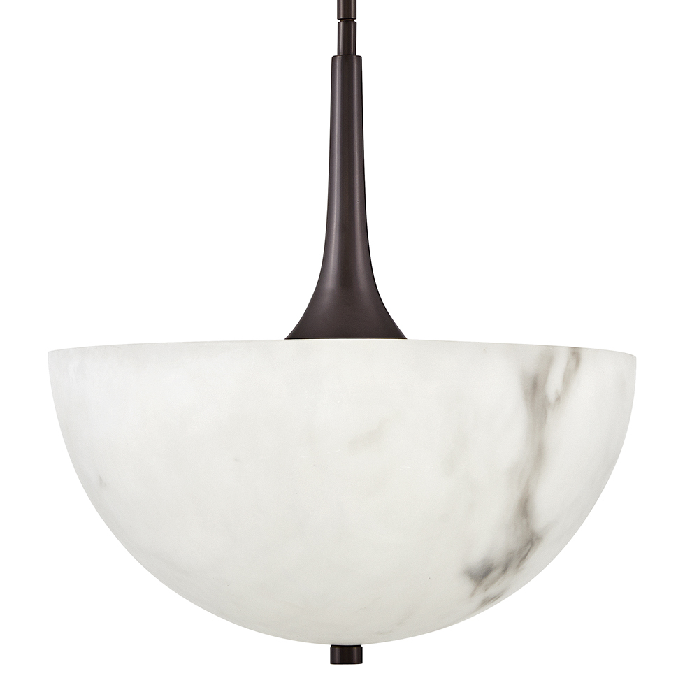 The Inez collection features a slim tapered stem that draws the eye to its Faux Alabaster shade, creating a streamlined silhouette with transitional design influences for an effortlessly chic look. Available in a Lacquered Brass or Black Oxide finish.