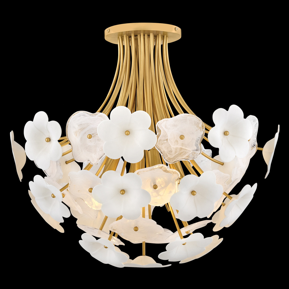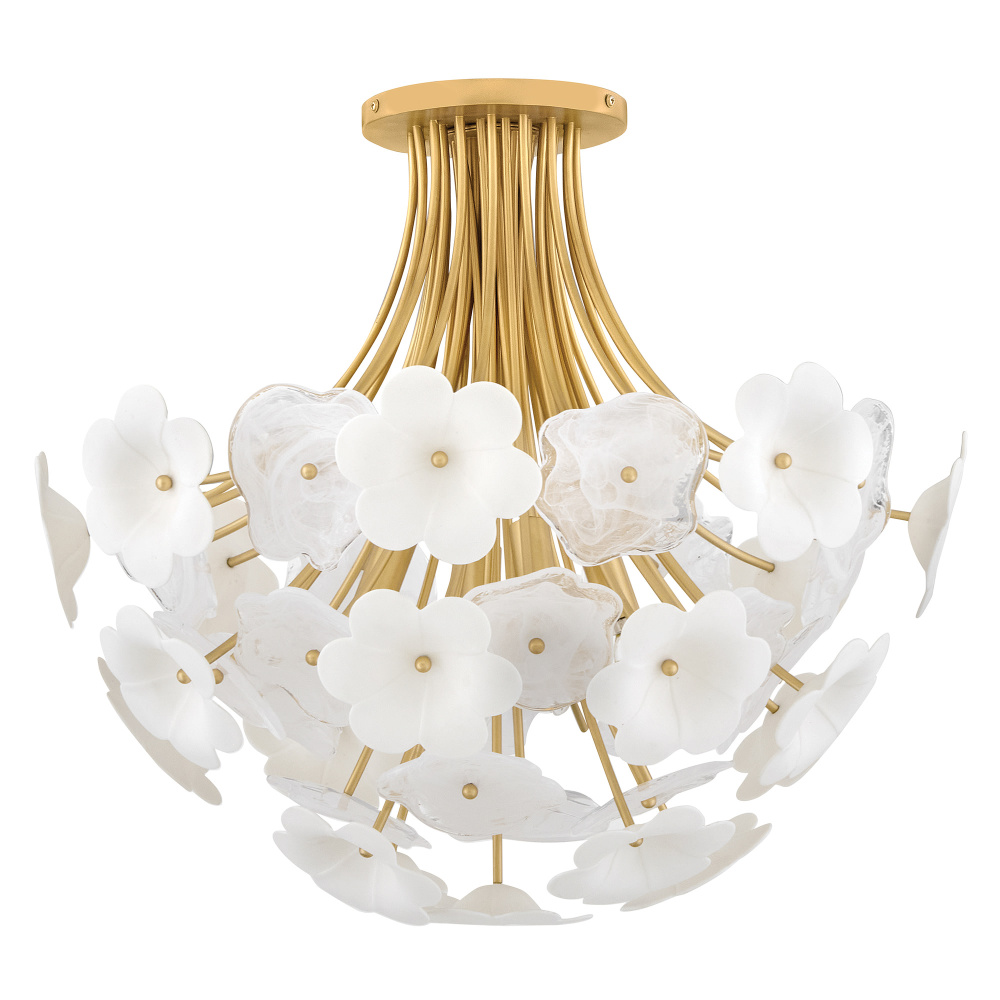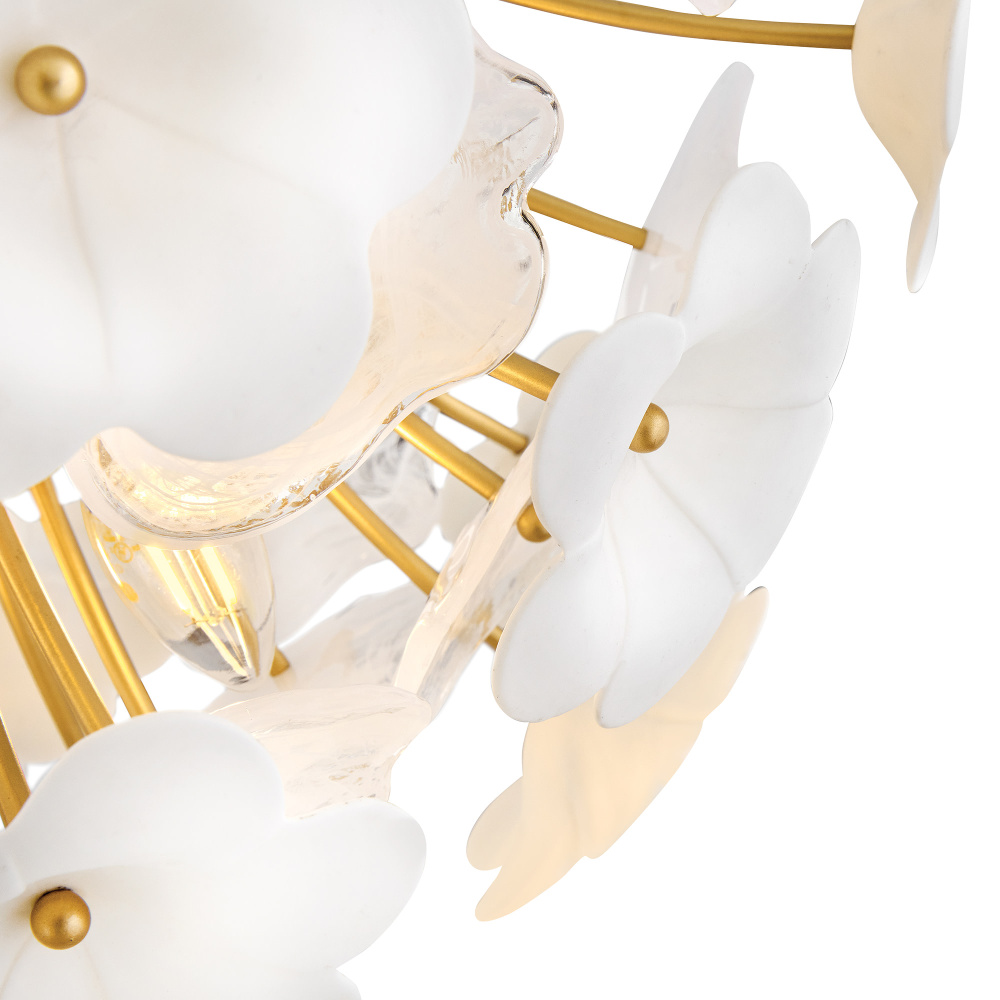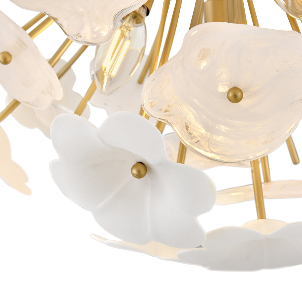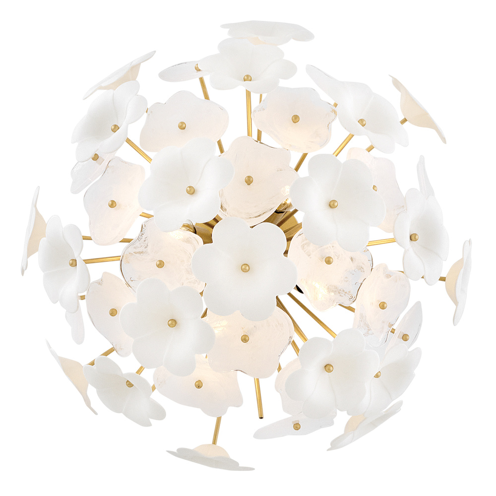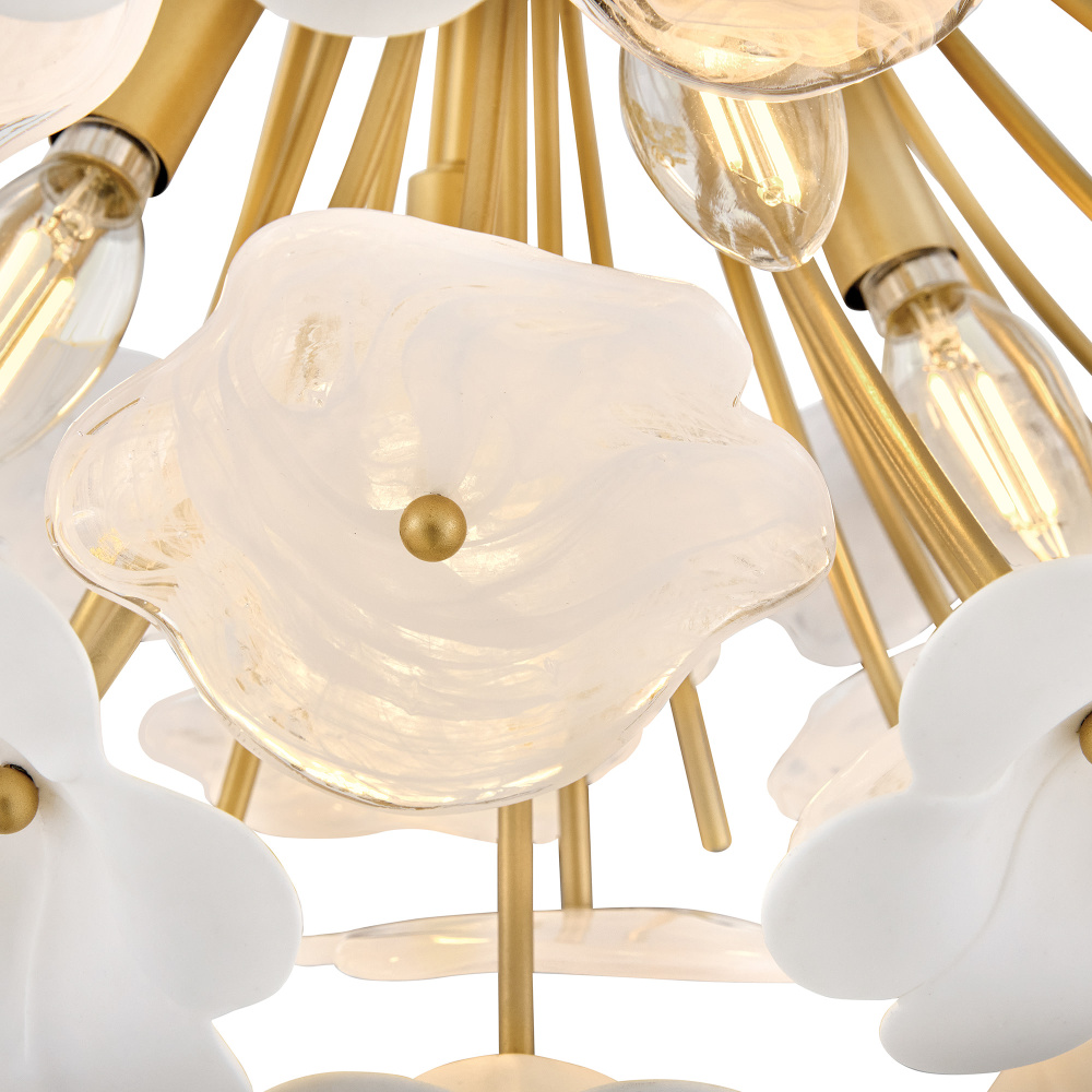Decadently arranged in glamorous clusters, Marianne’s white glass and ceramic blossoms create an elegant, organically inspired silhouette enhanced by a luxurious glow. Intricate frames in our Deluxe Gold finish capture warm, inviting illumination