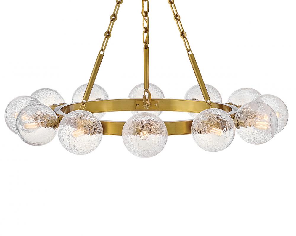 Dramatic crackled glass globes surround Coco’s timeless silhouette with unexpected, distressed detailing. Minimal framing suspended from decorative stem-to-chain uprights features a warm and inviting Lacquered Brass finish.