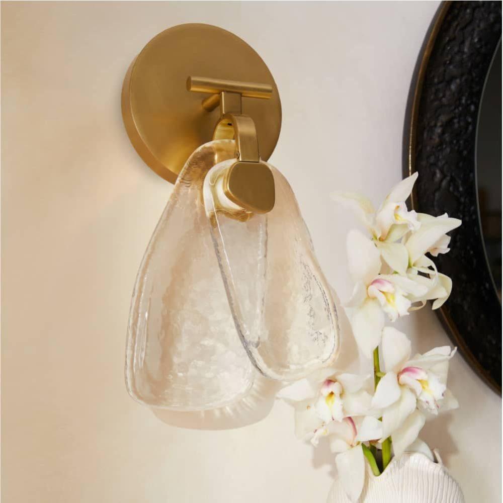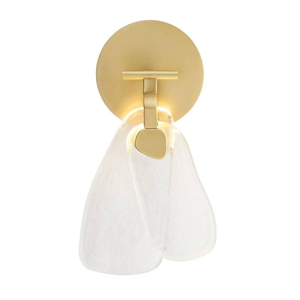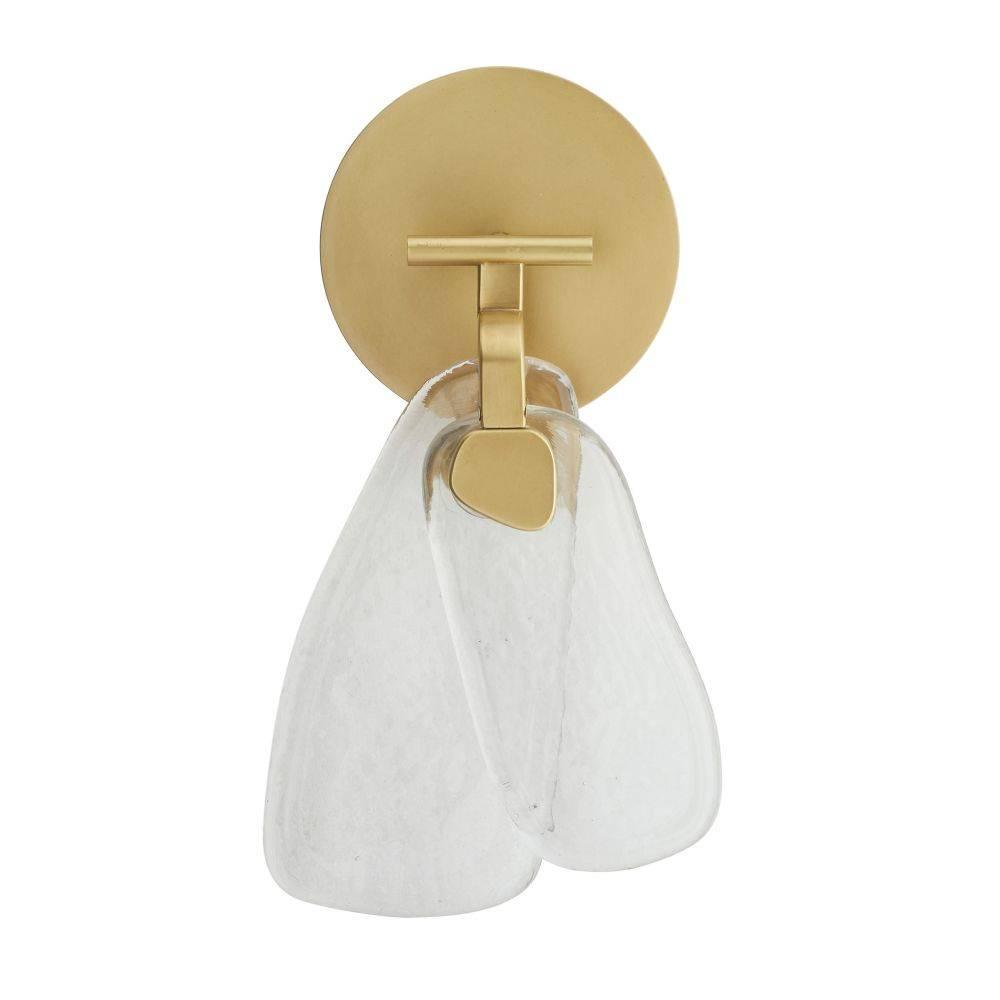 The Melt sconce features a pair of overlapping, textured cast glass drops held in place by an antique brass-plated iron plate. The layered, textured glass elements distribute and amplify the light, creating a lovely soft glow. Finish will vary.