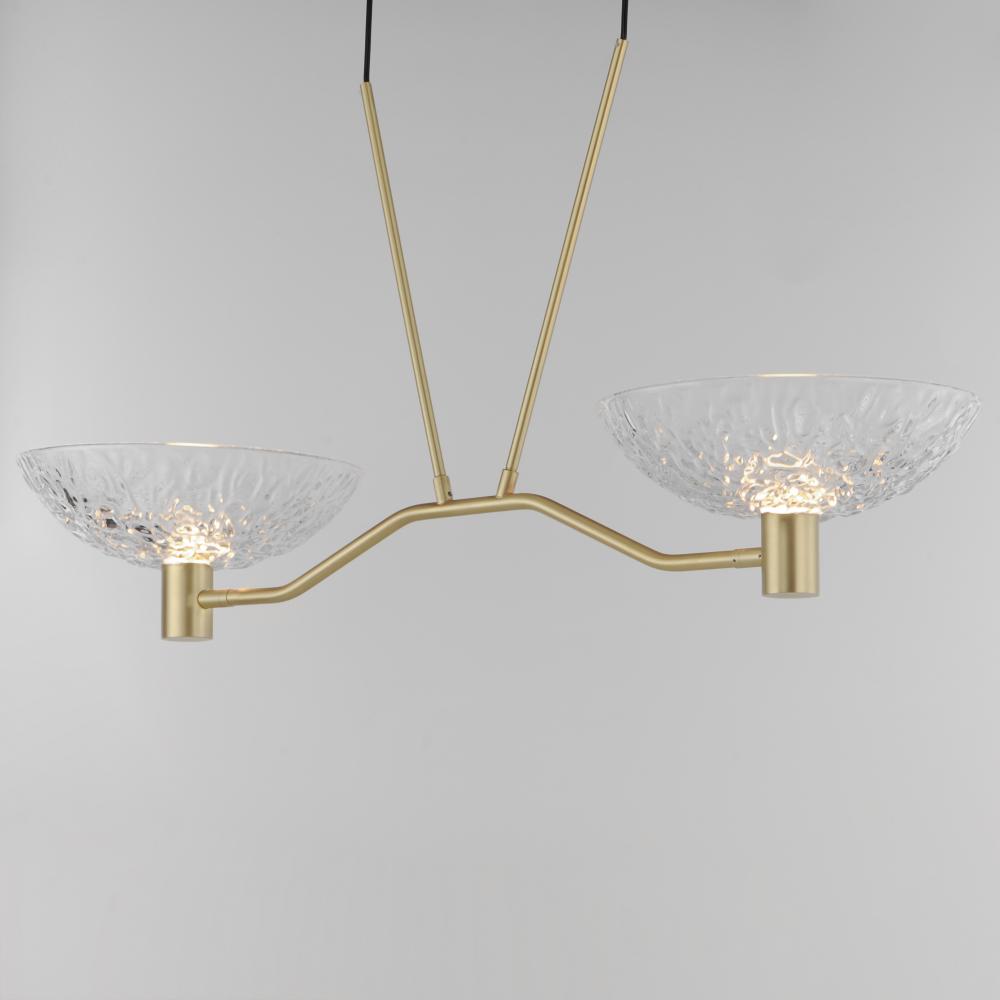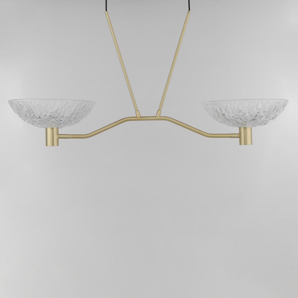 A modern take on the classic torchiere, the bright Satin Brass frames support thick textured glass cauldrons illuminated with dedicated LED modules. The 2-Light pendant and swing arm pin-up sconce feature rotatable shades directing the light either upward