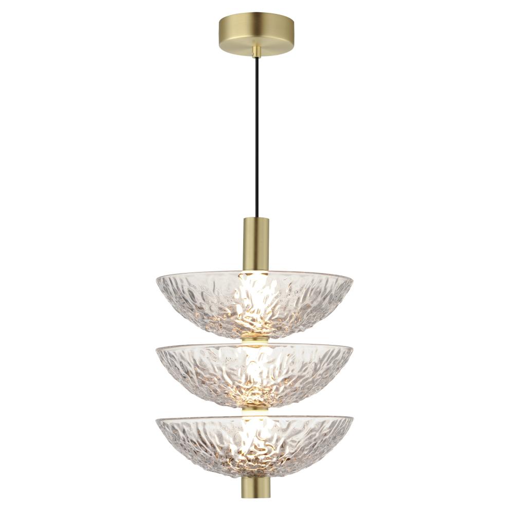 A modern take on the classic torchiere, the bright Satin Brass frames support thick textured glass cauldrons illuminated with dedicated LED modules. The 2-Light pendant and swing arm pin-up sconce feature rotatable shades directing the light either upward