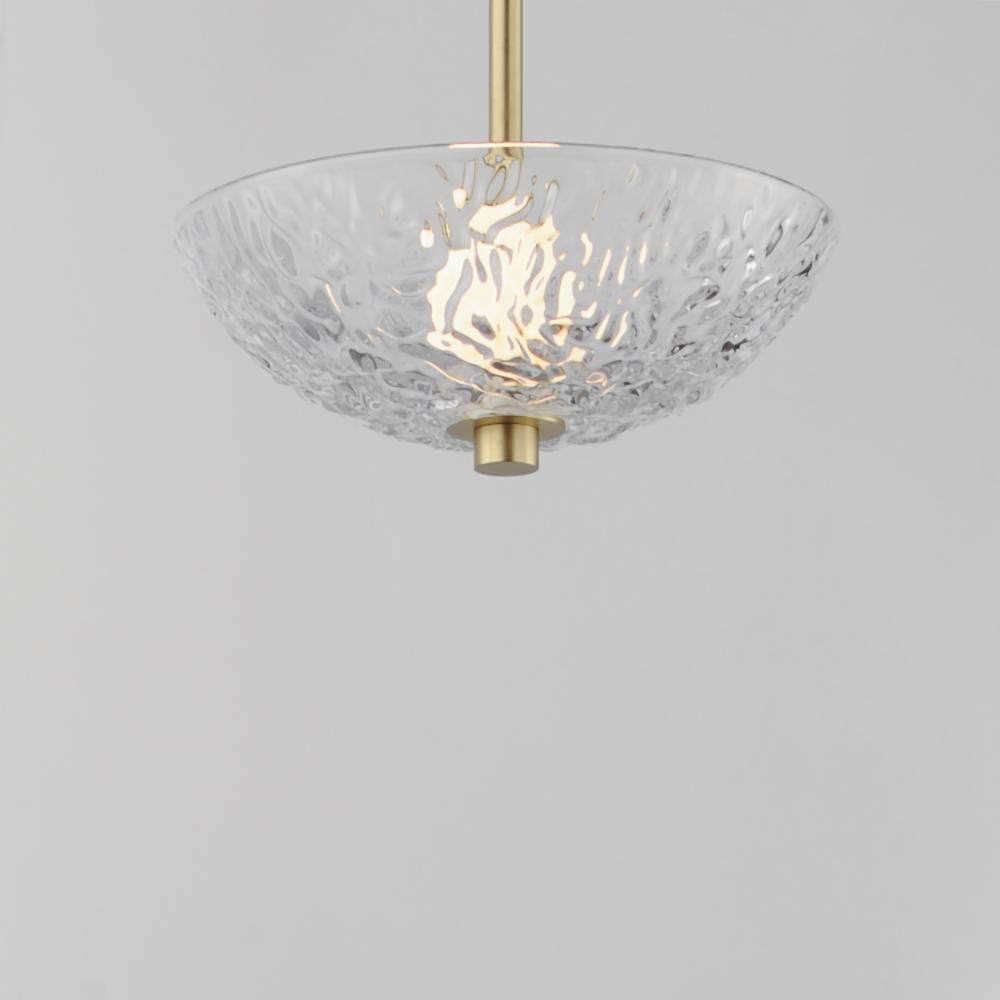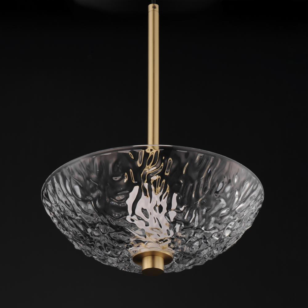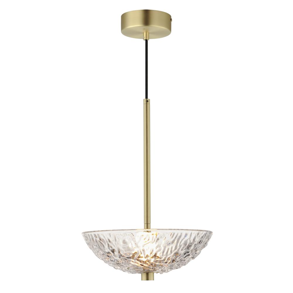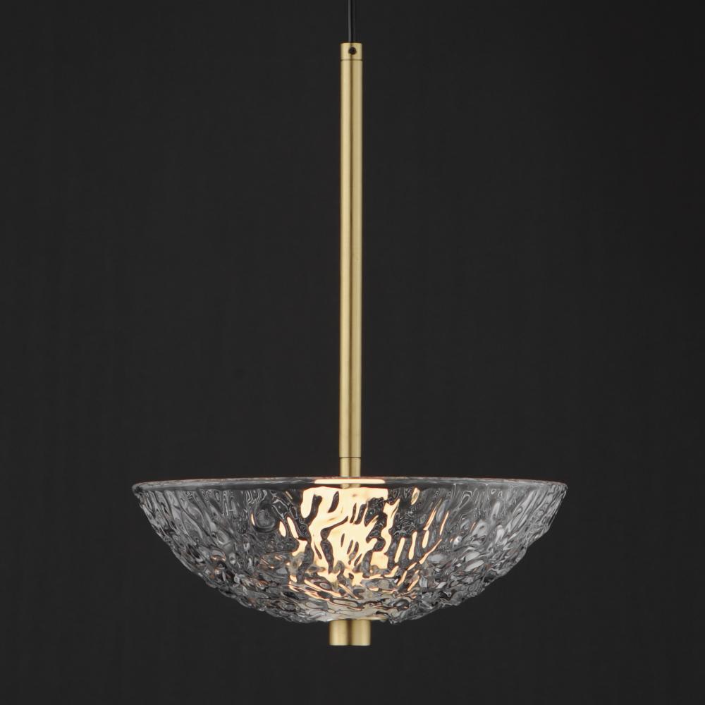 A modern take on the classic torchiere, the bright Satin Brass frames support thick textured glass cauldrons illuminated with dedicated LED modules. The 2-Light pendant and swing arm pin-up sconce feature rotatable shades directing the light either upward