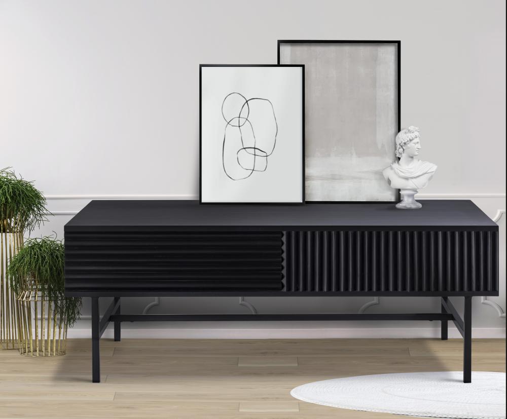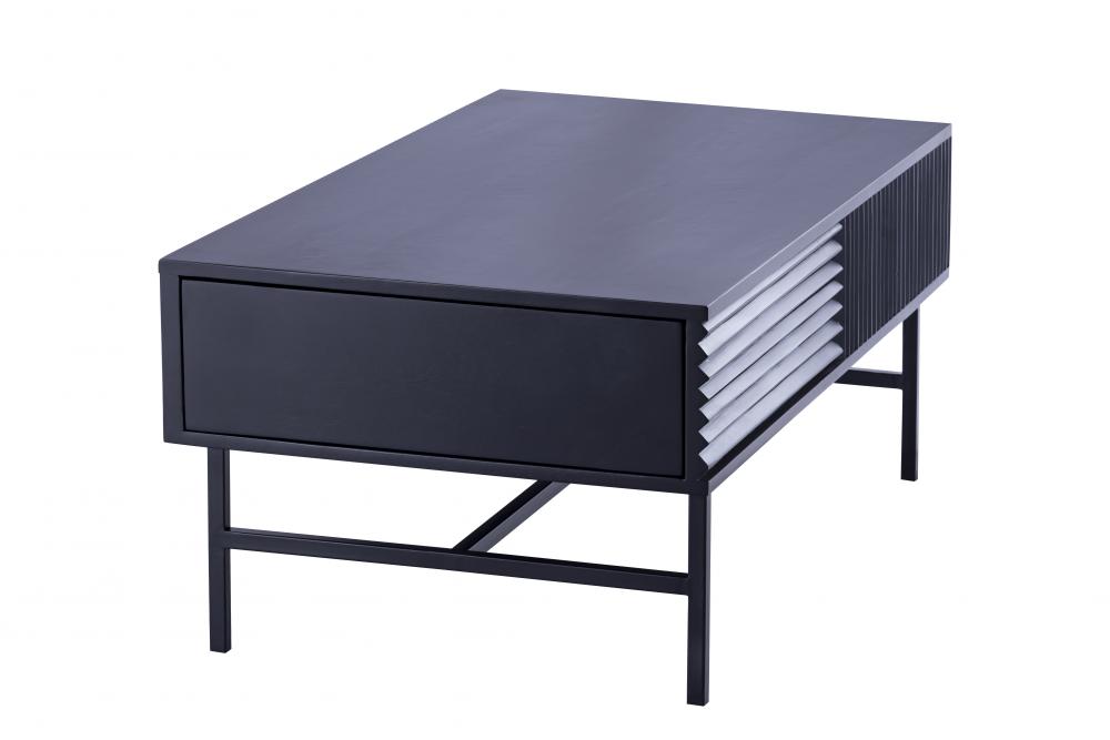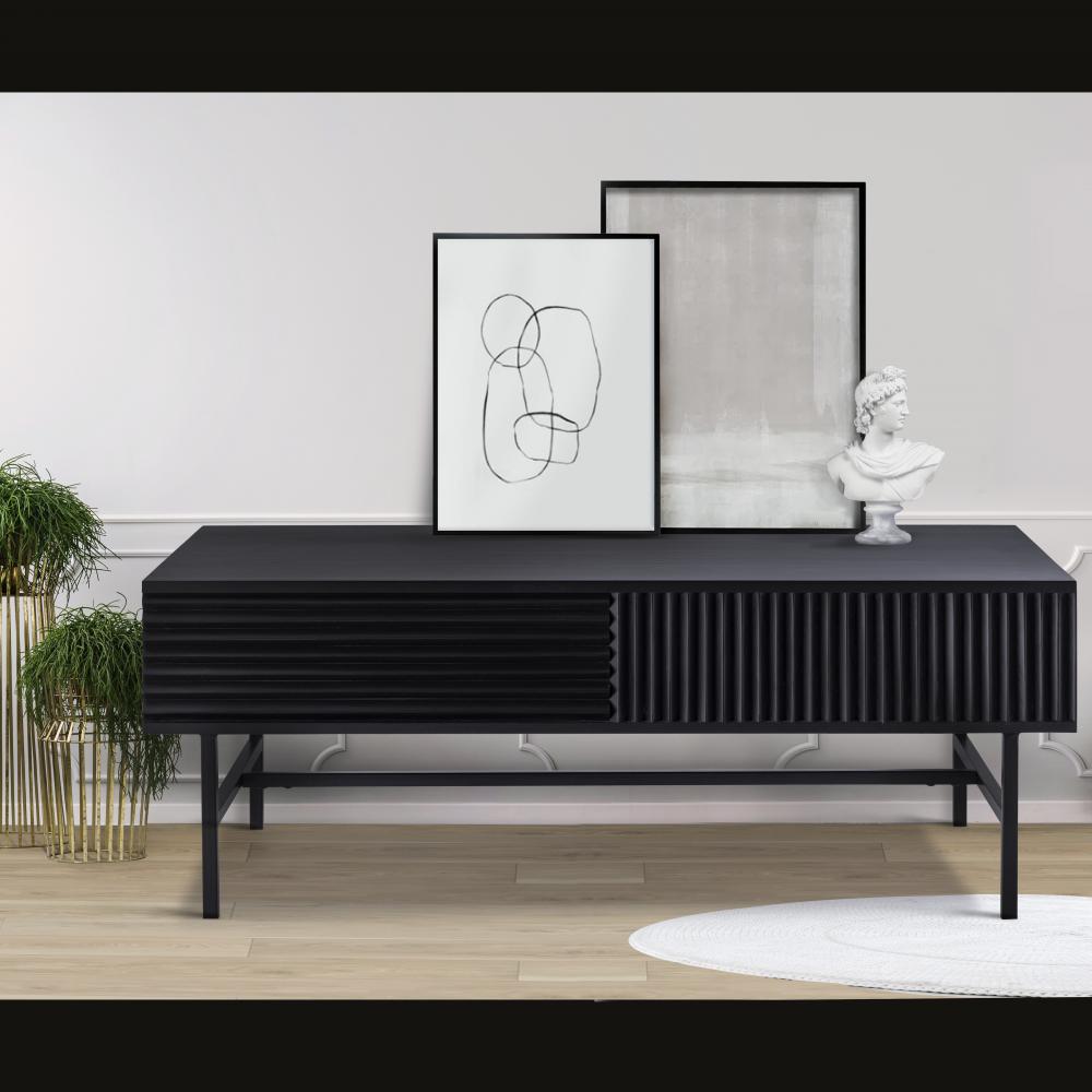 Introducing the MEZ Black Finished Coffee Table, a perfect combination of modern design and functional elegance. This coffee table features a sleek and sophisticated silhouette, crafted from high-quality iron and finished in a luxurious black. The unique ribbed design on the sides adds texture and depth, making it a striking focal point in any room.