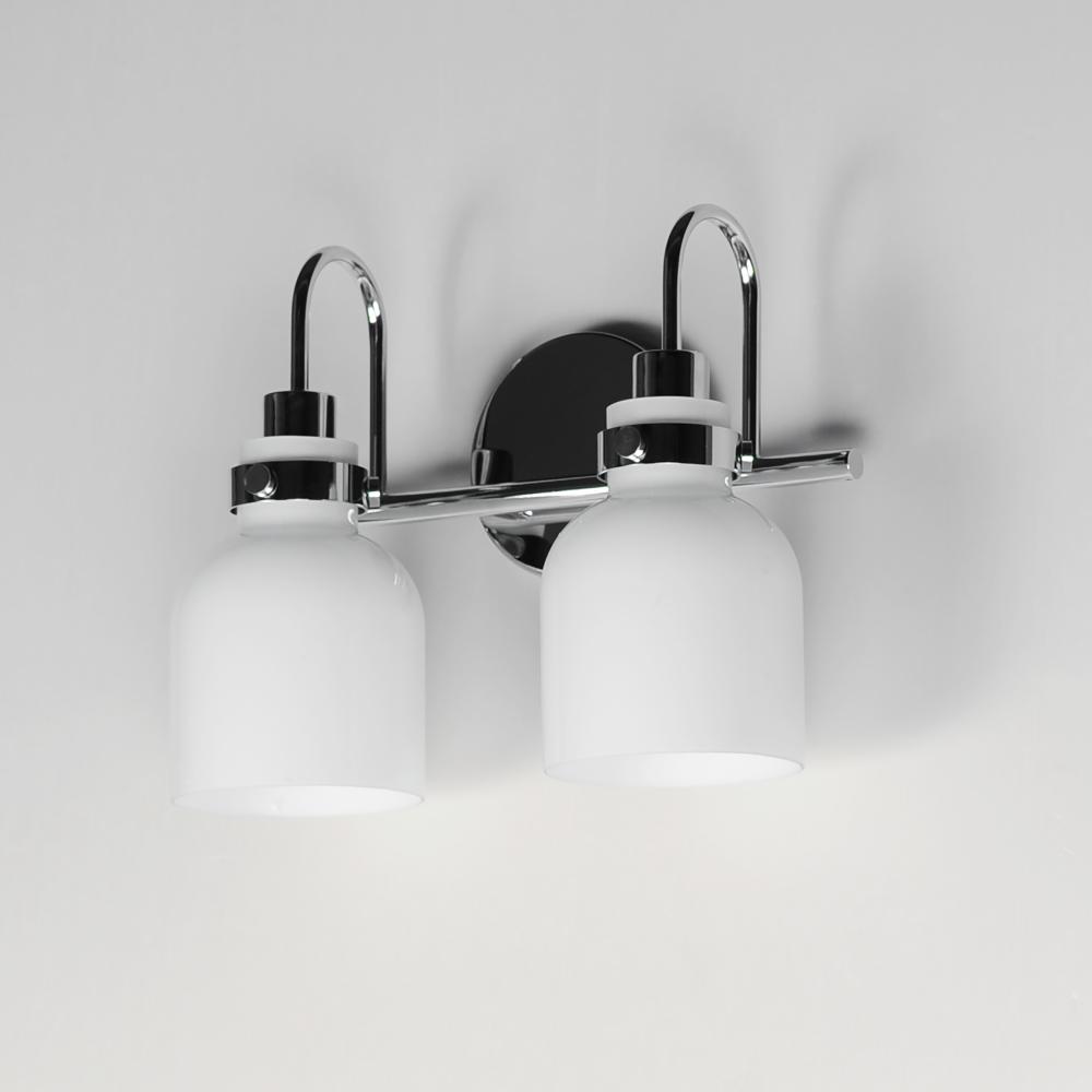 Celebrate nostalgia using these sconces that feature opal White glass shades in a bell shape. Supported on rings of metal in your choice of Polished Chrome or a bolder two-tone Black and Satin Brass, this refreshing take plays into a retro aesthetic of you