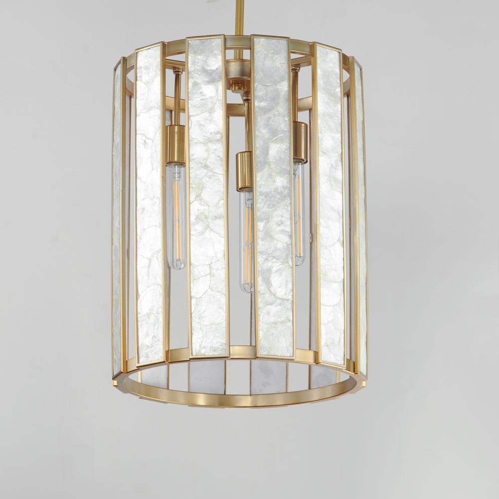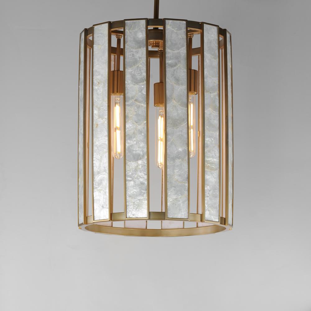 Classic in form and evoking the sea, laminae of Capiz shell are framed in paneled drum shapes. The Natural Aged Brass finish refines the coastal elements and complements the warm glow from behind the translucent panels. Available in multiple configurations