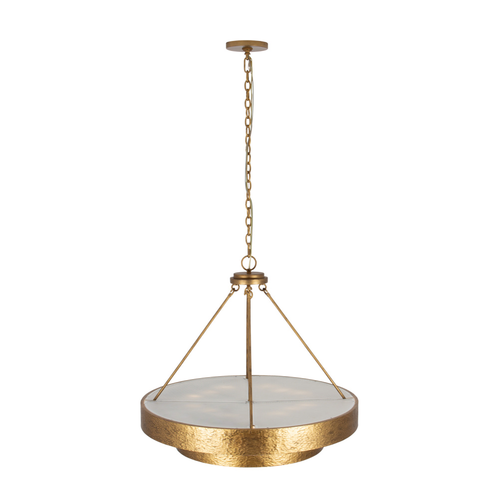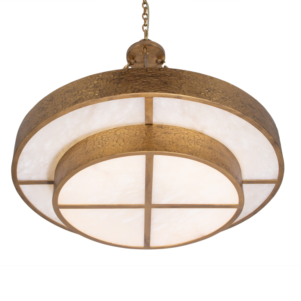 The Moda Collection, finished in Rustic Gold (RSG), combines both handworked steel and natural alabaster, to create a simple yet robust lighting pendant. The rich texture of both the metal and the alabaster harmoniously to create subtle visual complexities which pair well with the fixture's simple tiered framework.