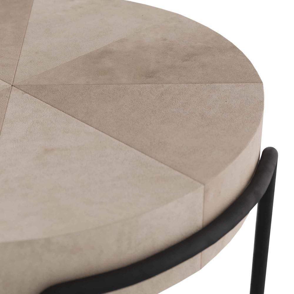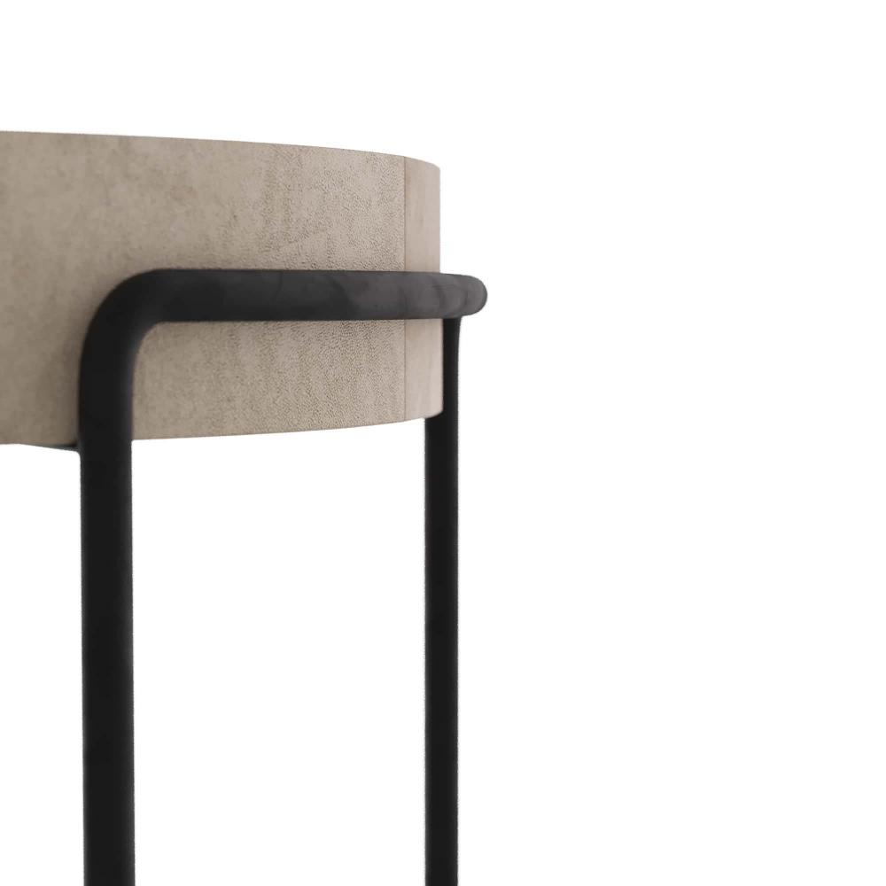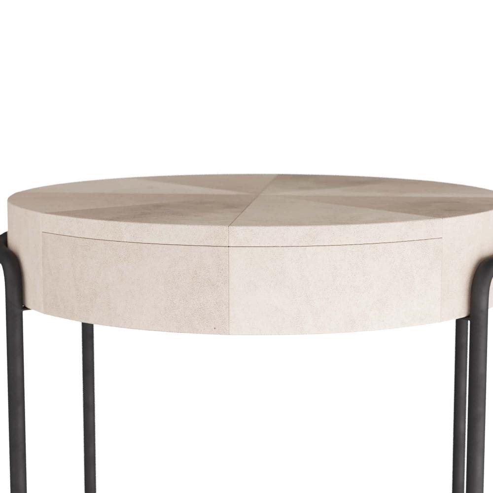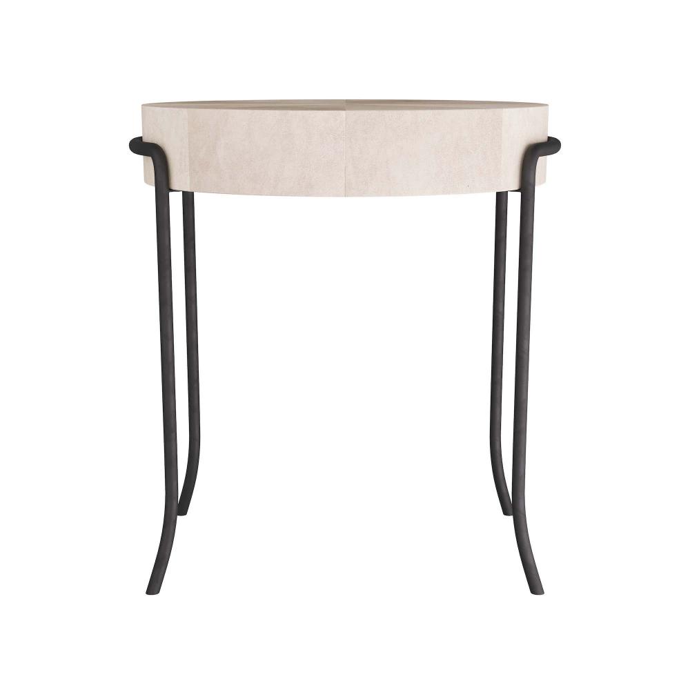 THE IVORY VELLUM SURFACE LENDS LUXE TEXTURE TO ANY ROOM IN THE HOUSE. THE BLACKENED IRON LEGS ADD CONTRAST TO THE TOP. PERFECT ON EITHER SIDE OF A SOFA OR BED. FINISH WILL VARY.