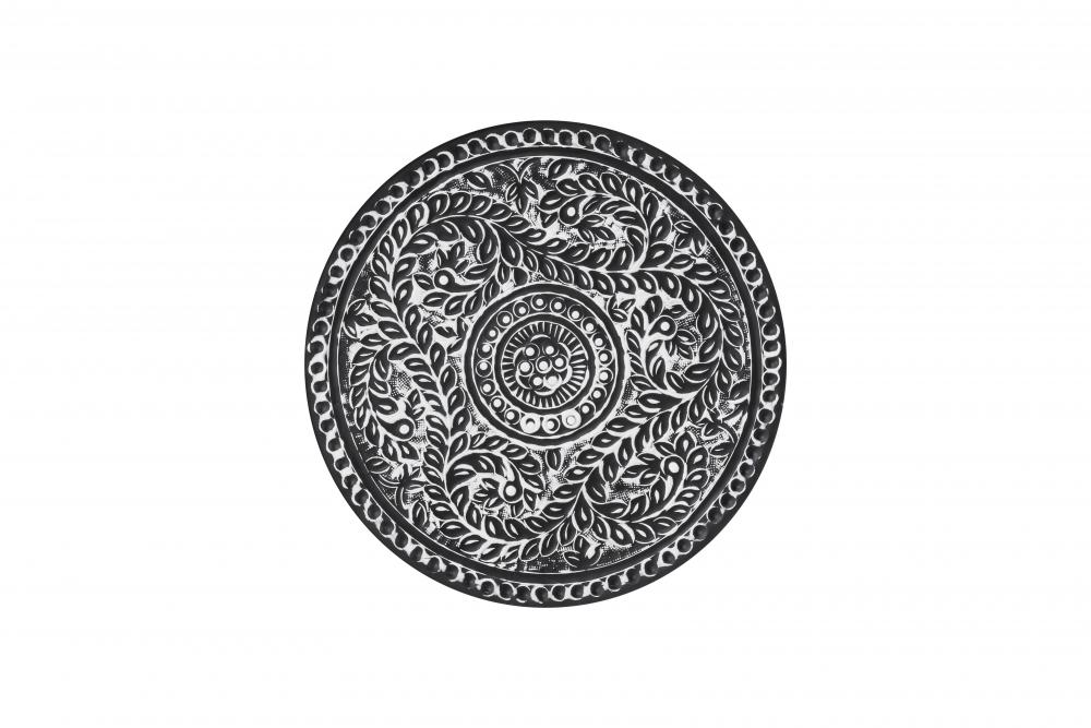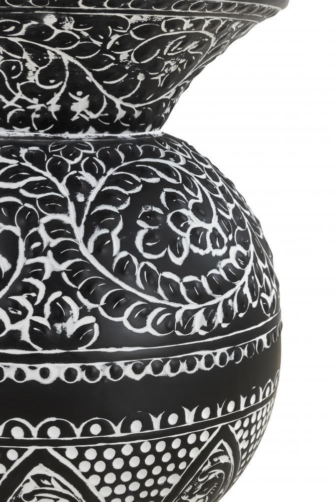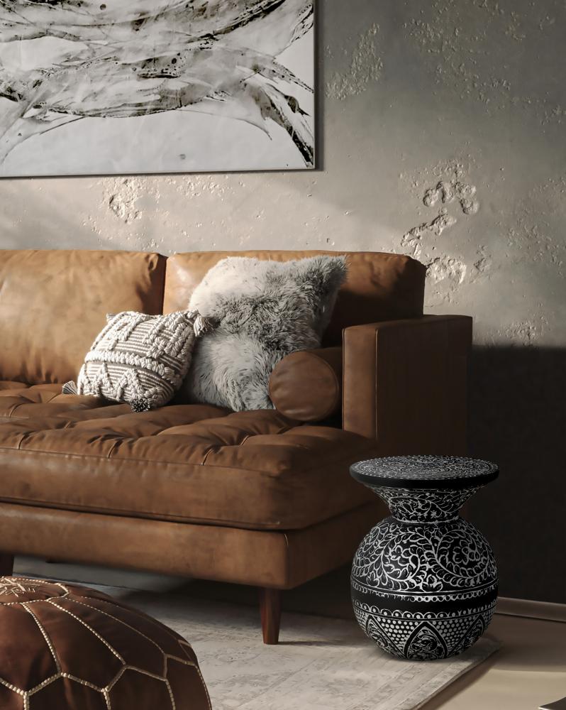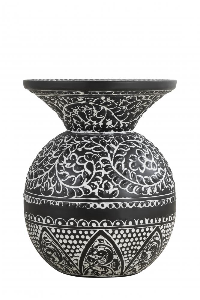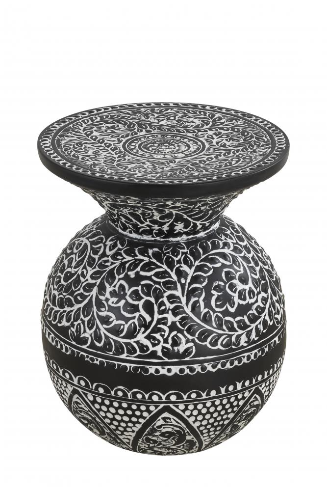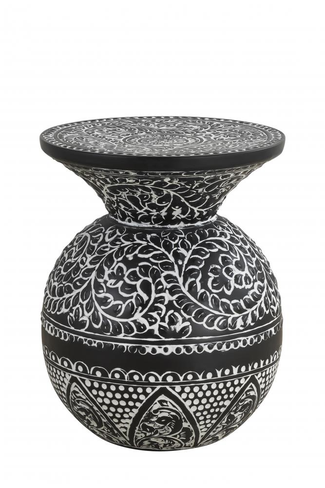 Introduce a touch of vintage elegance and intricate craftsmanship to your home with the NAVI Black with White Antique Finished Side Table. This exquisitely designed side table features a unique spherical shape adorned with detailed white antique patterns against a rich black background. The elaborate designs showcase the artistry and attention to detail, making this piece a standout addition to any room.