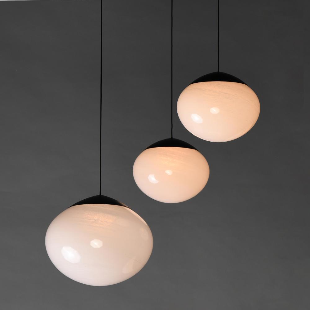 Oblong glass globe shades feature a intriguing Marble swirl pattern that obscures the integrated LED lighting within. Thin black electrical cords are easily adjustable. A larger oval 8-Light configuration features multiple sizes of the glass to create an i