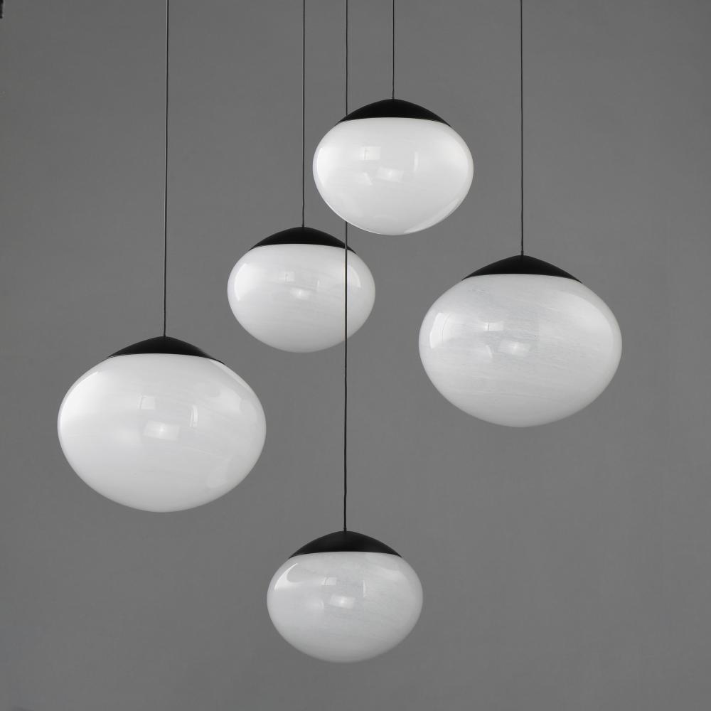 Oblong glass globe shades feature a intriguing Marble swirl pattern that obscures the integrated LED lighting within. Thin black electrical cords are easily adjustable. A larger oval 8-Light configuration features multiple sizes of the glass to create an i
