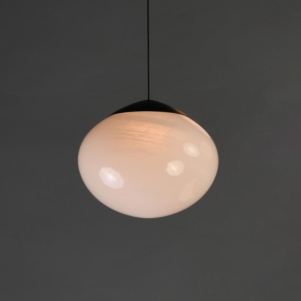 Oblong glass globe shades feature a intriguing Marble swirl pattern that obscures the integrated LED lighting within. Thin black electrical cords are easily adjustable. A larger oval 8-Light configuration features multiple sizes of the glass to create an i