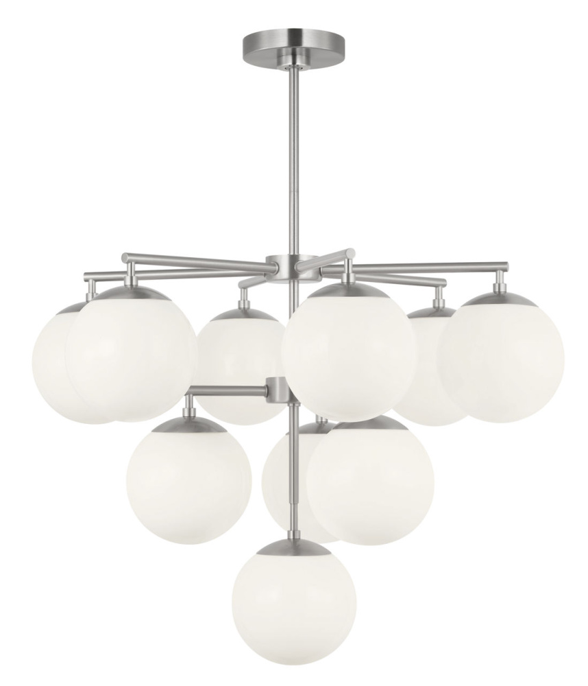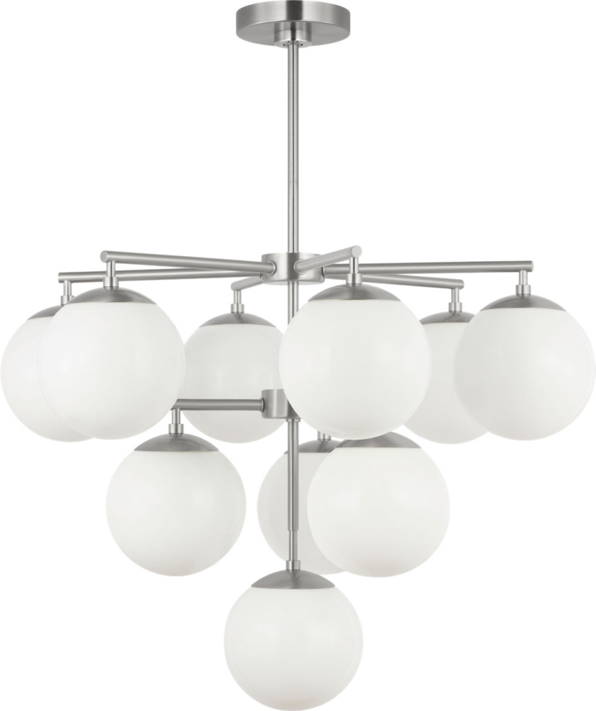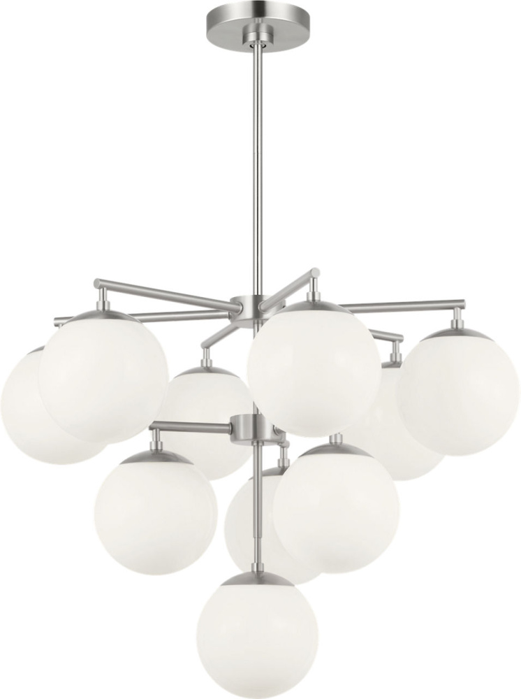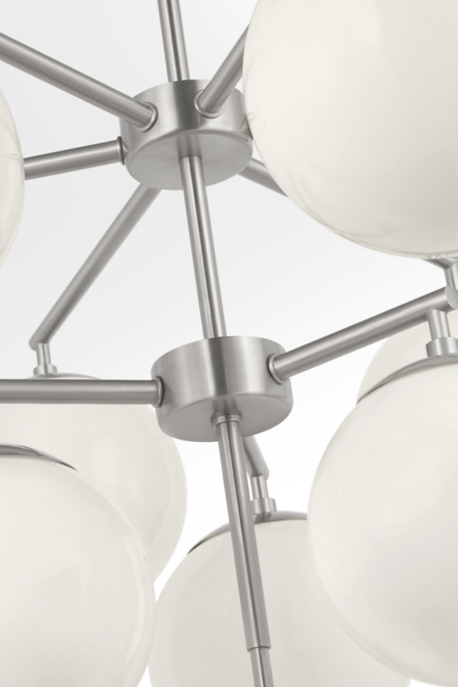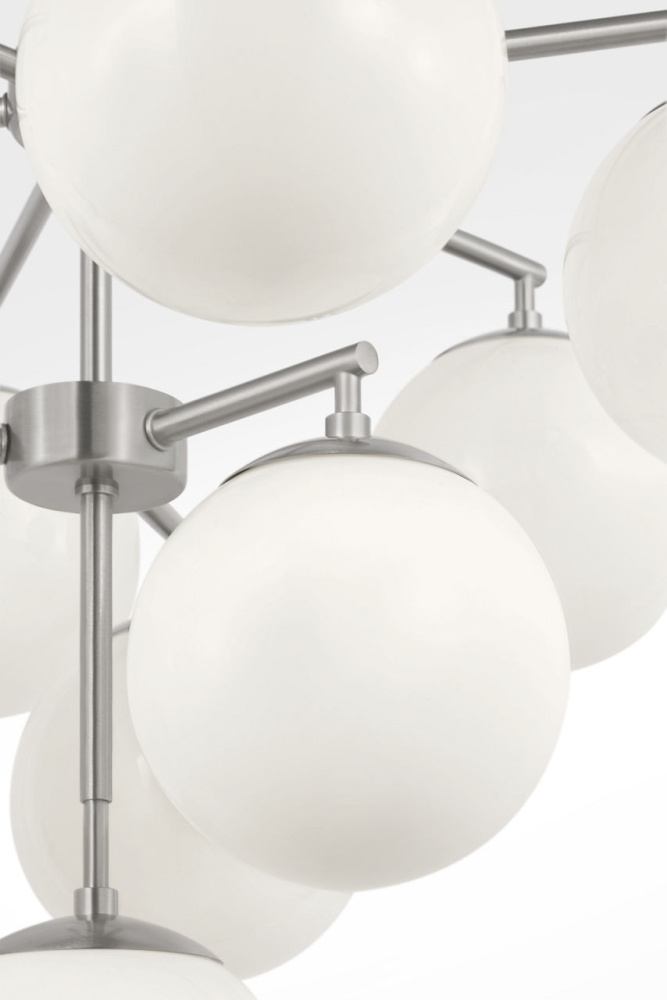 The Nube 10?Light Chandelier features ten layered milk glass globes that hover below a central hub and radial arms. Its balanced arrangement and open silhouette create an elegant focal point in large spaces such as grand living rooms or entryways. The chandelier delivers ambient, diffused light without heavy structure, allowing the glass forms to take visual precedence.
