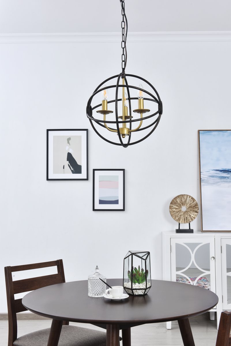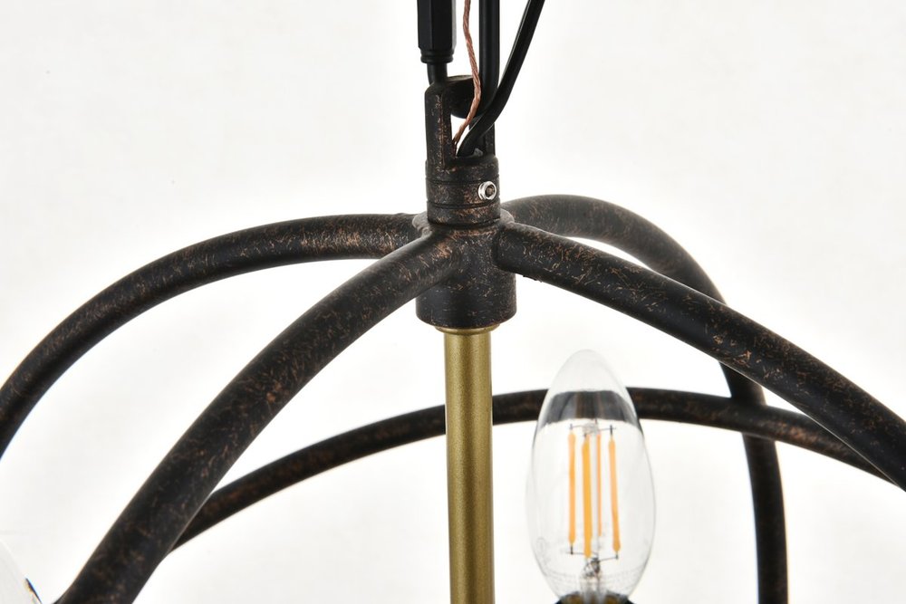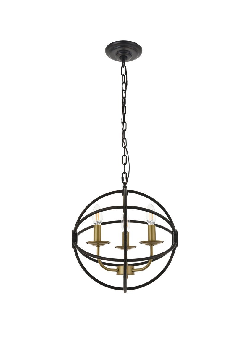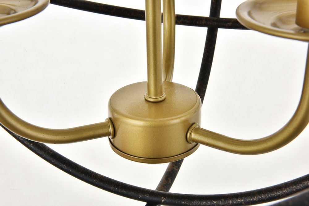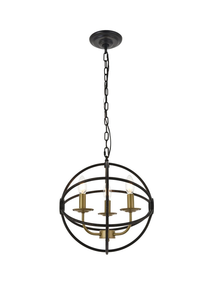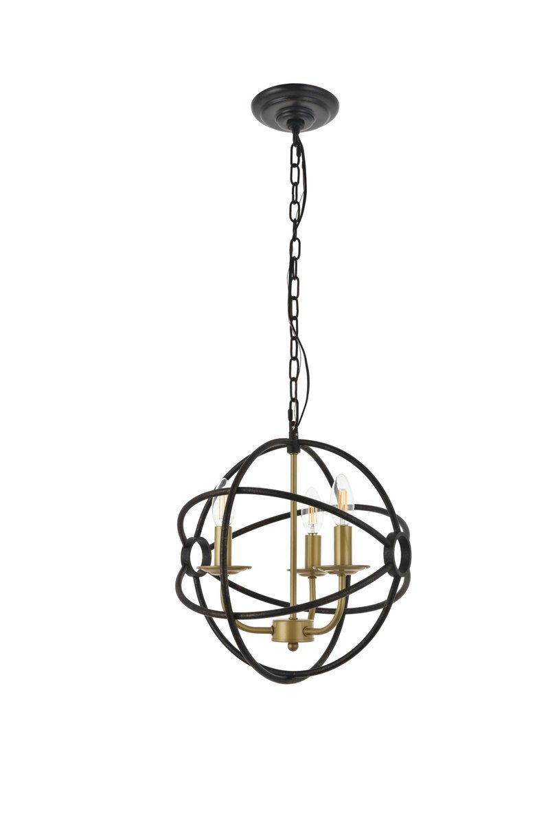 Two-toned brass and dark brown finish open gyroscopic frame with 3 candelabra styled lights within, giving off an old world charm