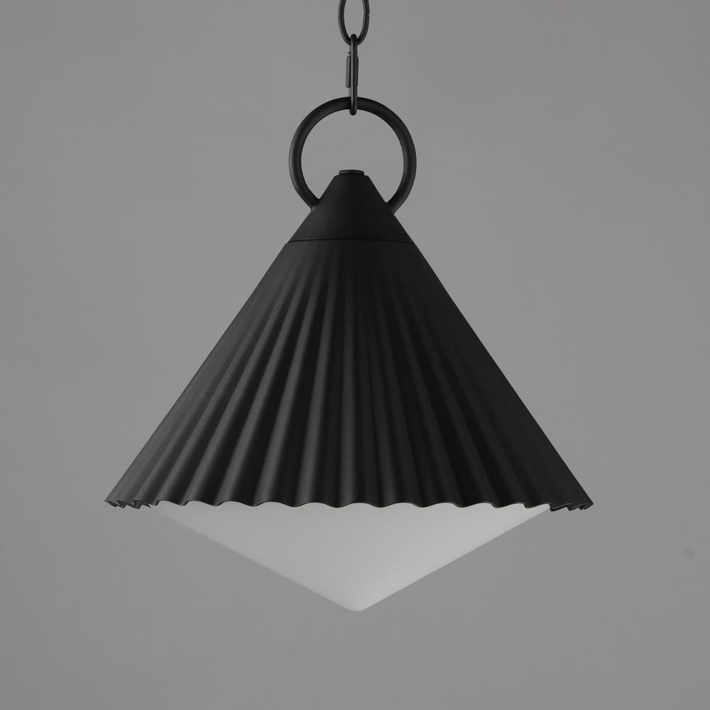 Adding charm to the outdoors, the Odette series features a scalloped pyramid shade suspended from a ring of Die Cast Aluminum. Supported within the shade is an inverse pyramid that peaks out beneath the hem of the aluminum shade marrying the two pyramid fo