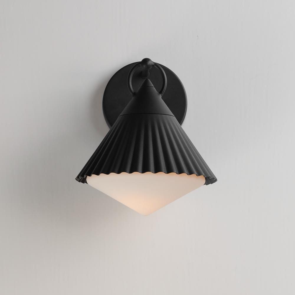 Adding charm to the outdoors, the Odette series features a scalloped pyramid shade suspended from a ring of Die Cast Aluminum. Supported within the shade is an inverse pyramid that peaks out beneath the hem of the aluminum shade marrying the two pyramid fo