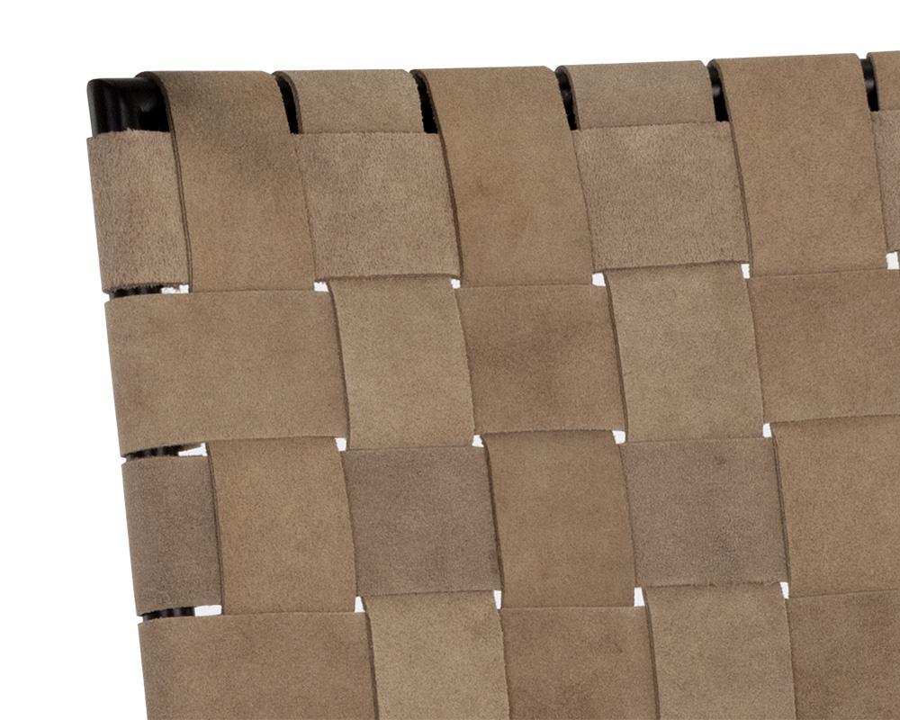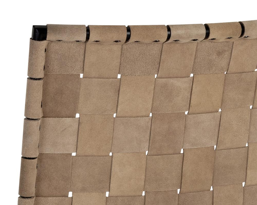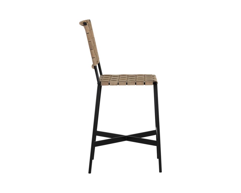 This elevated counter stool offers comfortable seating and unique style. Features a weaved seat in light tan suede leather and finished with a black iron frame. Handle with Care: This design has been crafted with 100% leather. Leather is a natural material; as such, colour variations, markings, wrinkles, grooves and light scratches are acceptable and appreciated characteristics. No two pieces are alike.
