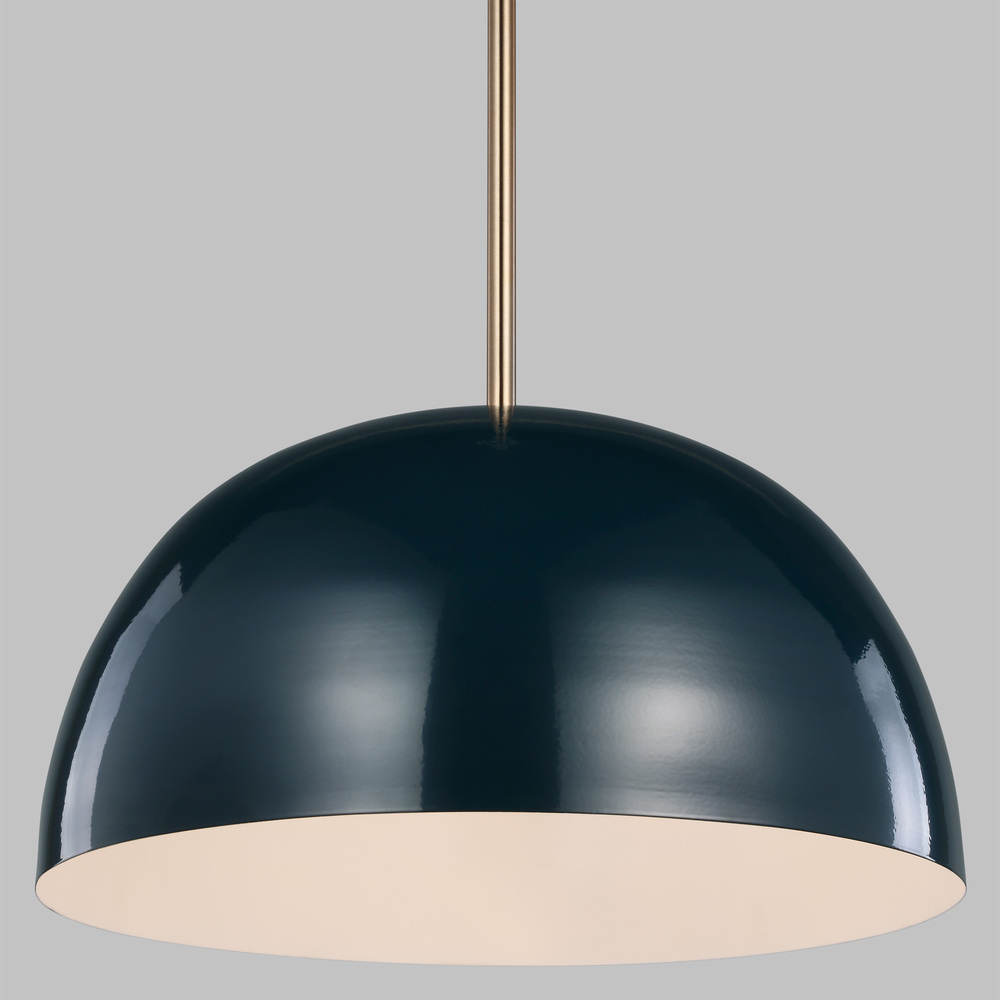 The Ivan one light indoor pendant in Dutch Blue features a classic dome silhouette. The painted white interior of the shade will reflect the light from a standard 60 watt bulb and fill your space with a beautiful warm glow and ample downward focused light. Available in three finishes.
