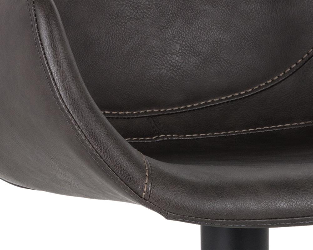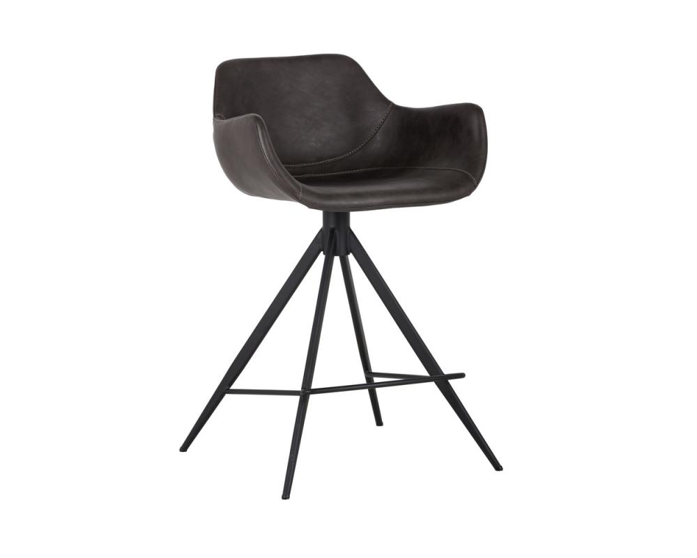 This comfortable swivel counter stool is a mix of masculine, modern and urban design in town grey faux leather with black powder coated iron legs and a footrest. Features a 360° swivel range. Suitable for residential and contract environments and various dining, kitchen and bar spaces of all sizes. Handle With Care: This design has been crafted with faux leather. Faux leather is manufactured to reflect the natural characteristics of leather; as such, colour variations, markings, wrinkles, grooves, and light scratches are appreciated characteristics. No two pieces will be alike.
