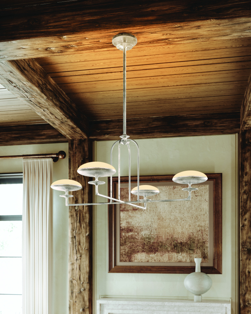 The Pacific family responds to the need for uncomplicated, yet sculptural chandeliers in contemporary interiors. A handcrafted Warm Silver Leaf finish adds texture to the geometric shapes, architectural arches, and decorative bobeches while the etched matte glass shades provide a soft diffusion of light. Available as a 1-light wall sconce, 2-light linear, and 3 or 4-light chandelier, Pacific creates a stunning focal point in any space.