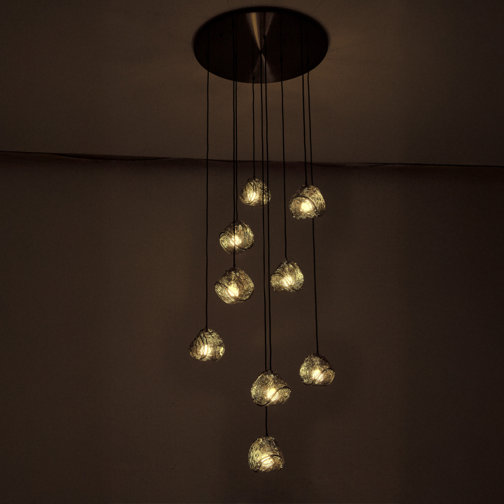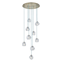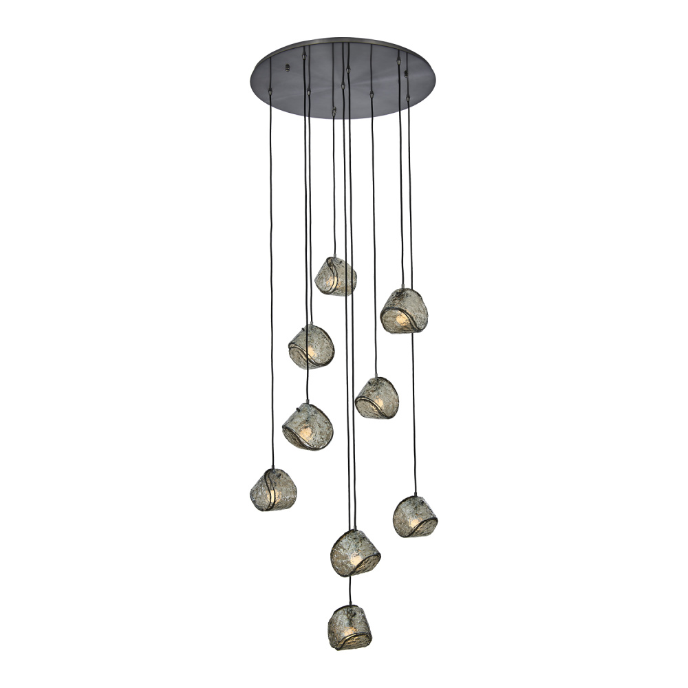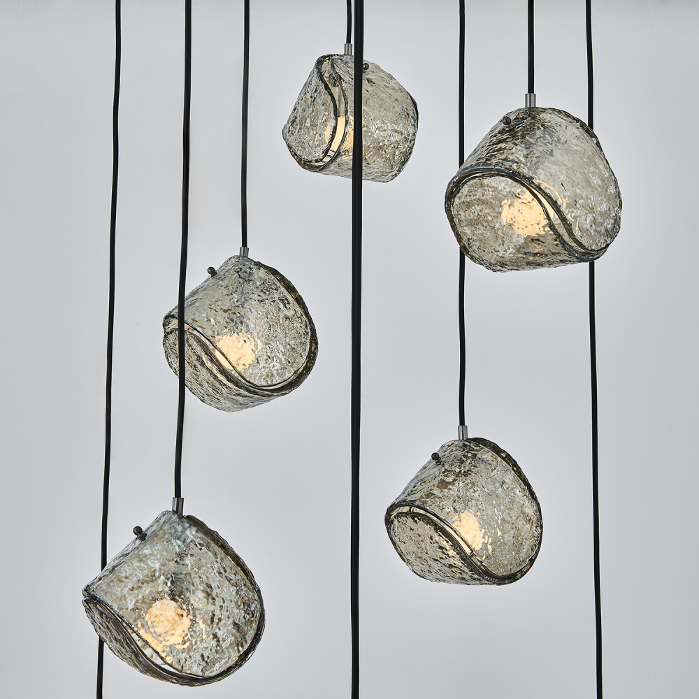 This versatile and contemporary family features a variety of multi drop arrangements and color options to add a designer touch to any space. Inspired by the construction and pattern of the tennis ball, this unique, textured glass comes in clear or smoke, and is paired with a coordinating colored power cord and a Winter Brass (WB) or Satin Black Nickel (SBN) finish.