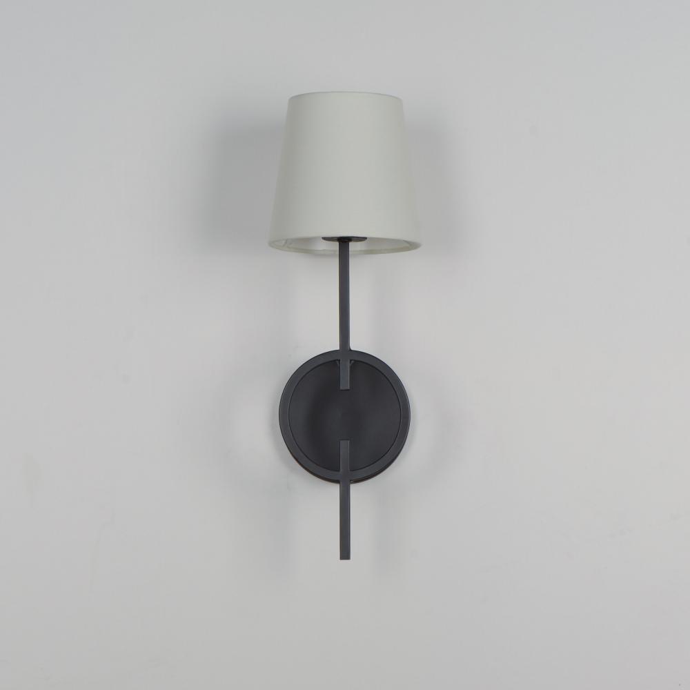 A clean frame with an oversized ring detail is finished in Charcoal Bronze. Featuring oversized Off-White Linen shades on two configurations of pendants, the collection also includes a two-tier chandelier and wall sconce.