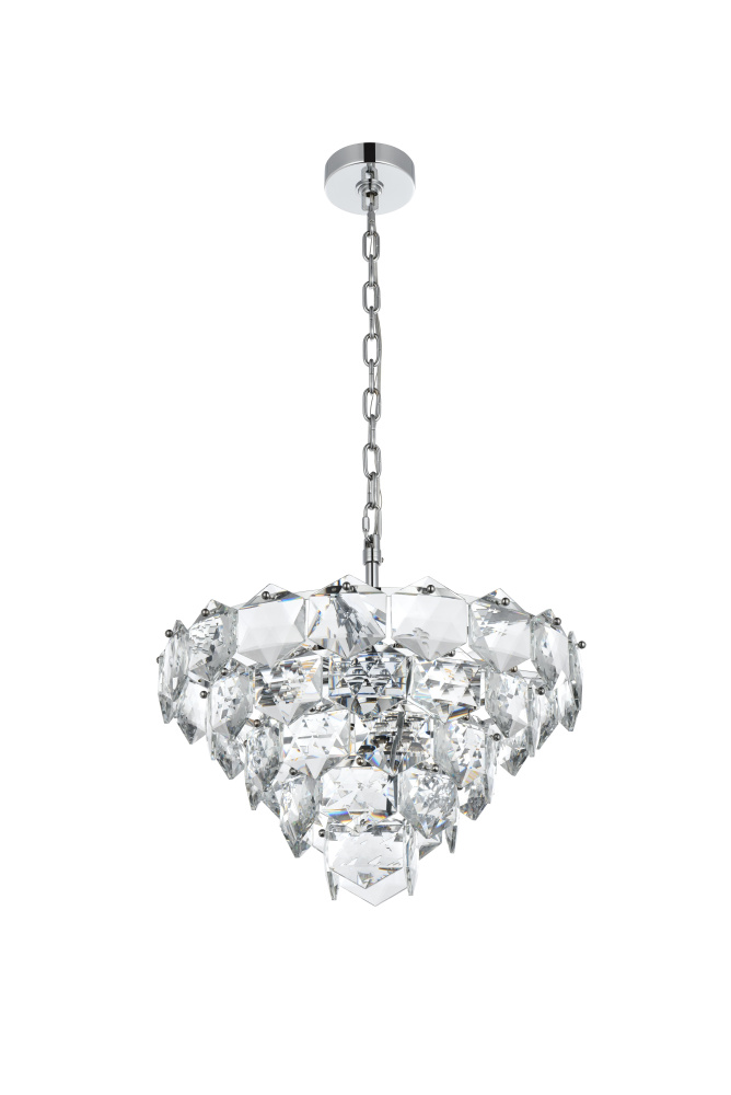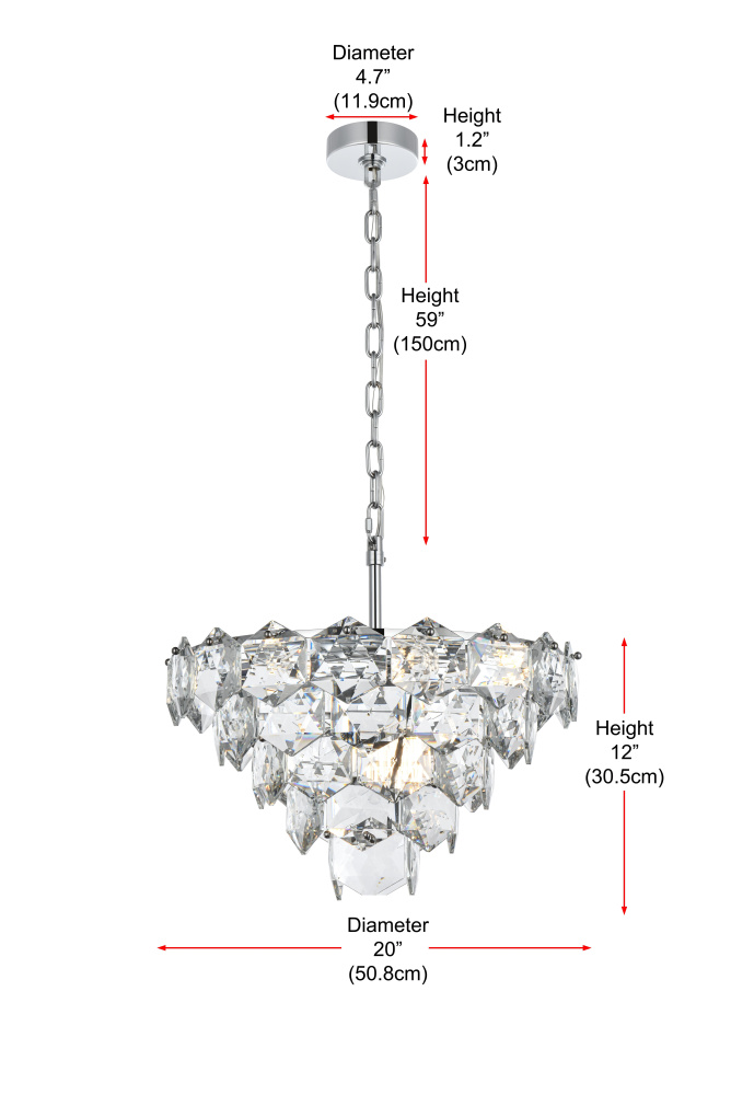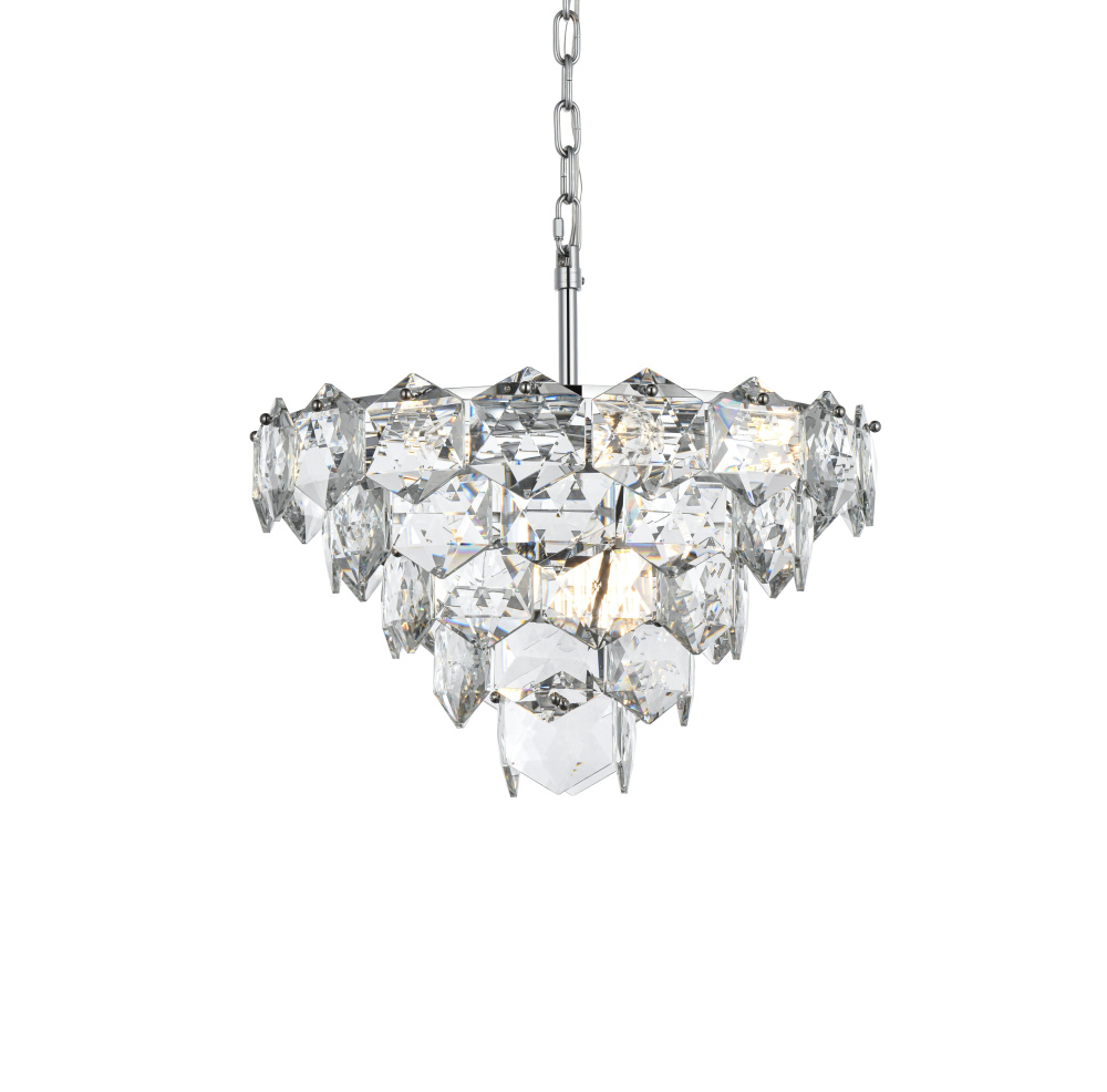 Features a stunning multi-tier arrangement of faceted crystals cascading down, creating a layered, dynamic visual effect that draws the eye and adds depth to any room.