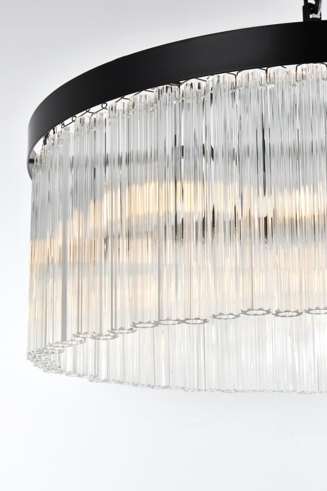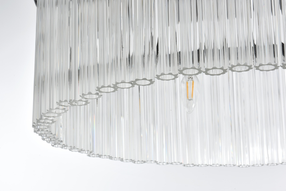 The clear ribbed glass panels cascade in shimmering layers, refracting light into a dazzling, multidimensional display.