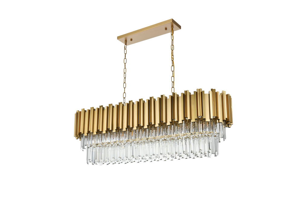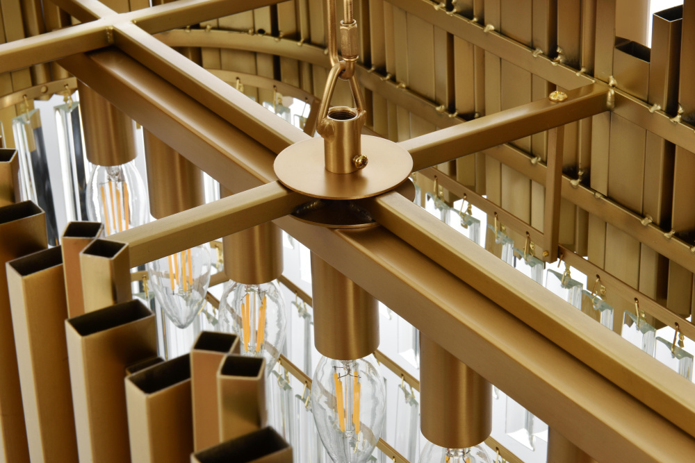 This chandelier boasts a bold rectangular frame adorned with staggered iron and clear glass elements, creating a striking architectural aesthetic that commands attention.
