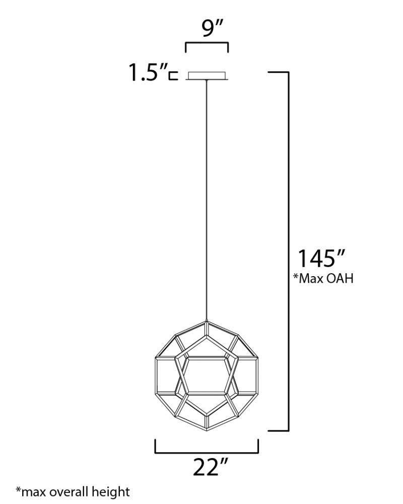Formed by a series of Black pentagons into a spherical shape, this geometric collection is illuminated from the inside for a dramatic lighting effect. Available in 3 sizes ranging from 22" to the dramatic 40" large pendant.