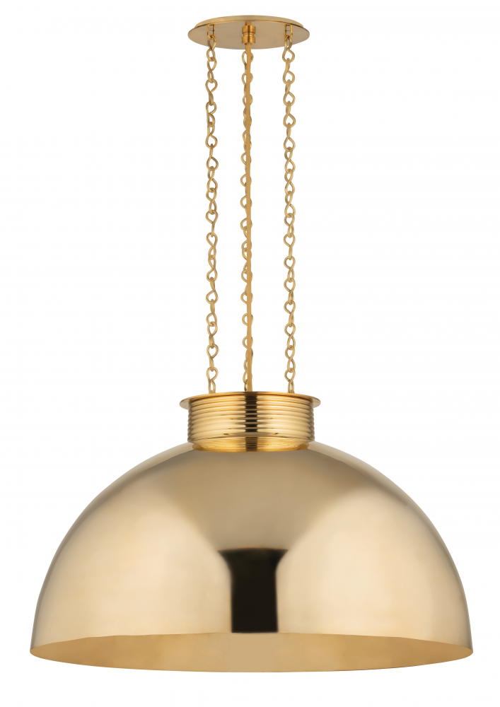 Suspended by three delicate decorative chains, this large-scale dome fixture is designed to bring refinement to everyday spaces. The allover Vintage Brass finish is refined and reflective, while the textured metal ‘bangle’ hardware gives the silhouette a jewelry-like feel. Available in two sizes, Perseus makes a bold, dynamic impression in modern spaces.