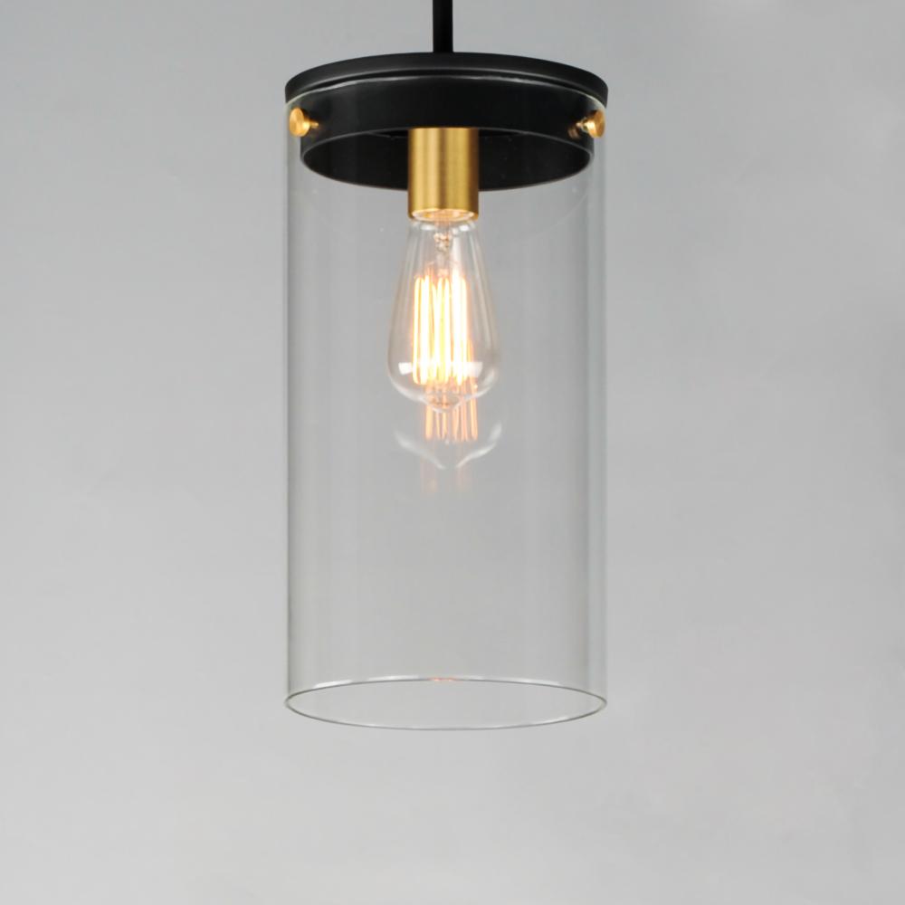 Simple clear glass cylinders are secured by decorative thumb screws in this transitional collection of sconces and pendants both neutral in design and suitable for damp applications. Choose from Satin Nickel or a two-tone Black and Satin Brass finish to pa
